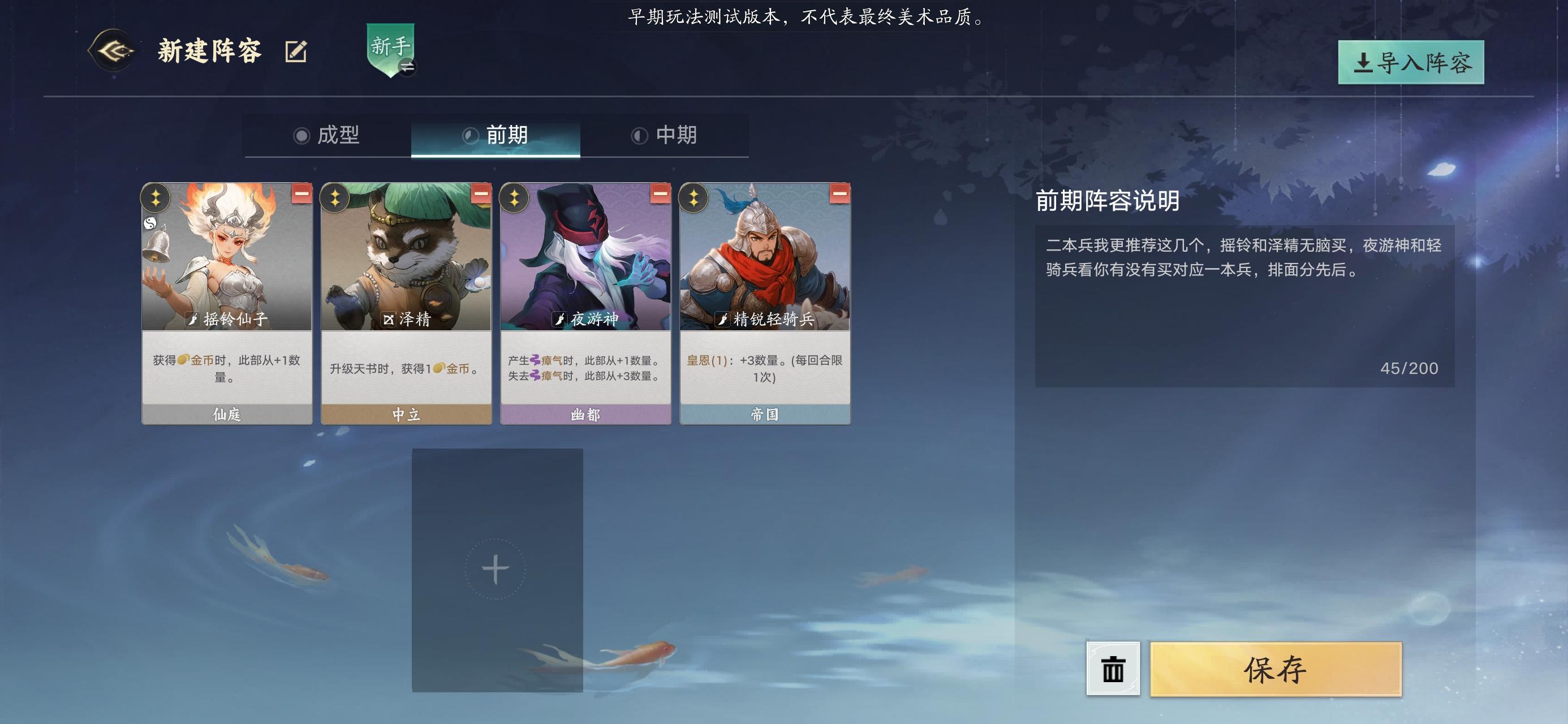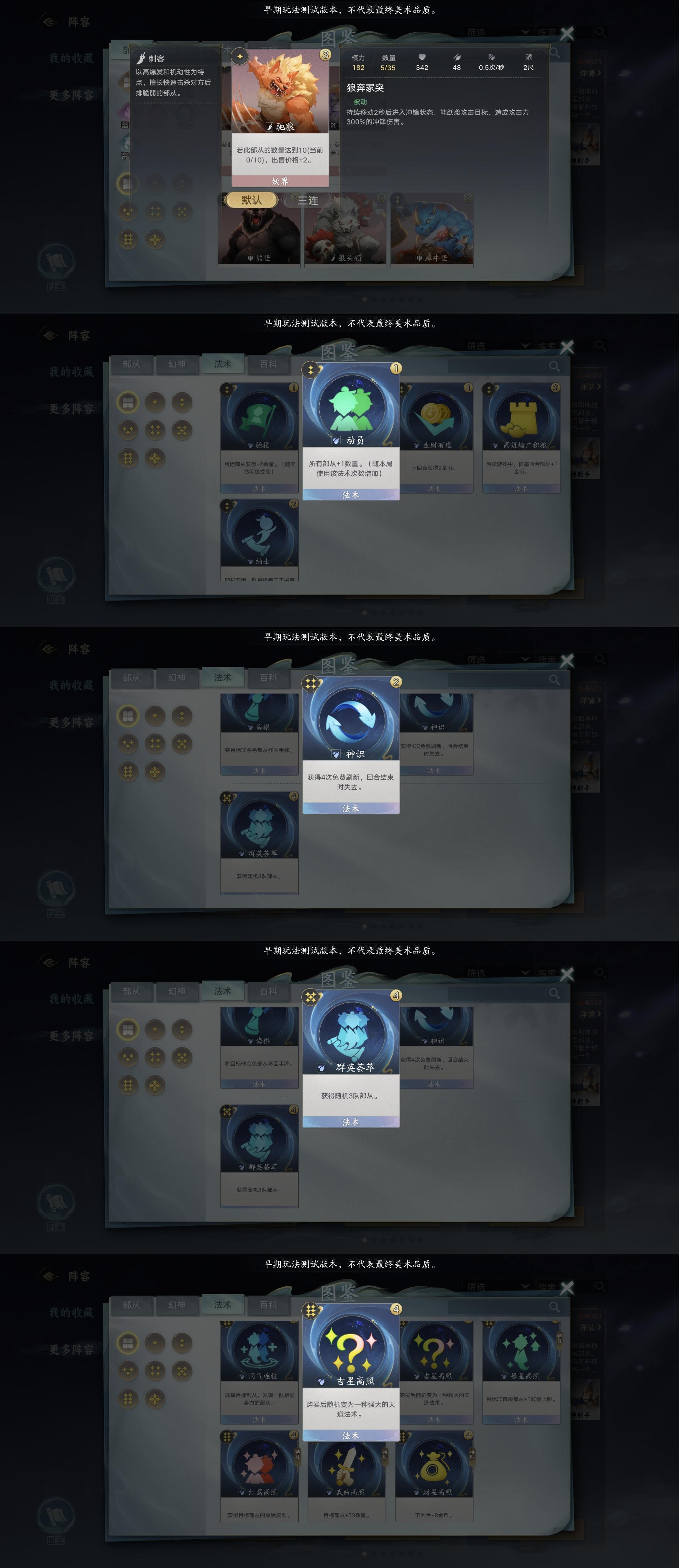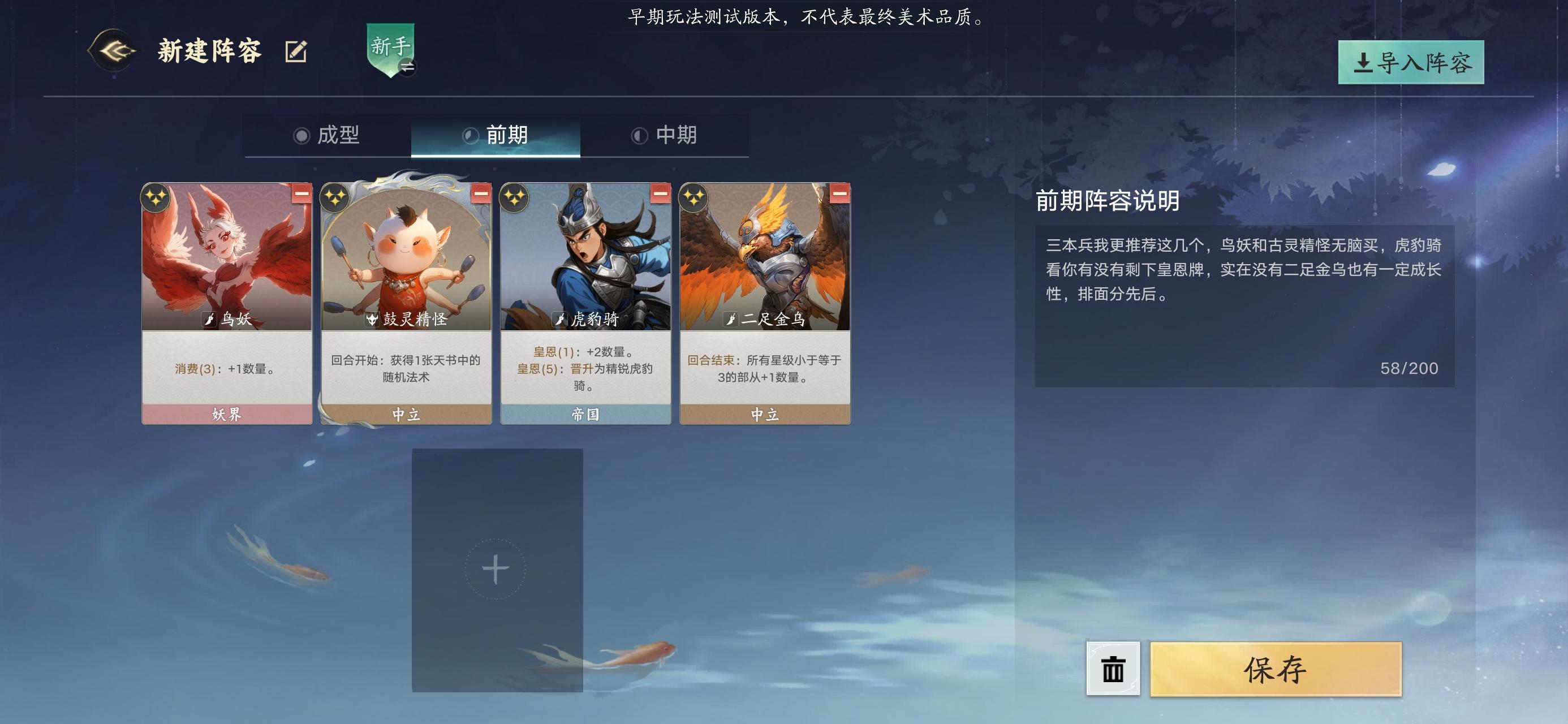 妖族消费骑是个人比较喜欢用的流派,别问为什么,问就是喜欢骑兵冲锋的感觉。上测最喜欢的是虎豹骑,依靠虎豹骑前中期发育快的优势,在其他后期阵容还没开始发育起来的空档,提前把它们创死。可惜这测帝国大改,把最重要的资源卡挪到了三本。(还是忍不住想吐槽一下,究竟是哪个鬼才设计师一拍脑洞想出来的修改方案,其他阵营抛开变卦的天庭不说,妖族的蜘蛛精,龙宫虾铳手,地府的阴兵,都是产出对应资源的,都是一级兵,凭什么帝国就放到三本去。这个阶段你跟我说不升本,不提战力,把金币用来搜资源卡,然后再升四本继续花金币搜神射手,不是发牌员的亲儿子建议千万别这么玩,很容易被拖死。上测我玩得最多就是帝国,这测头铁硬玩,只能说全看发牌员心情,7-10回合战力波动极大,全看来不来牌,上限本来就不高了,下限还不太稳定,看看这测还有多少人玩帝国就知道,新手慎入。)