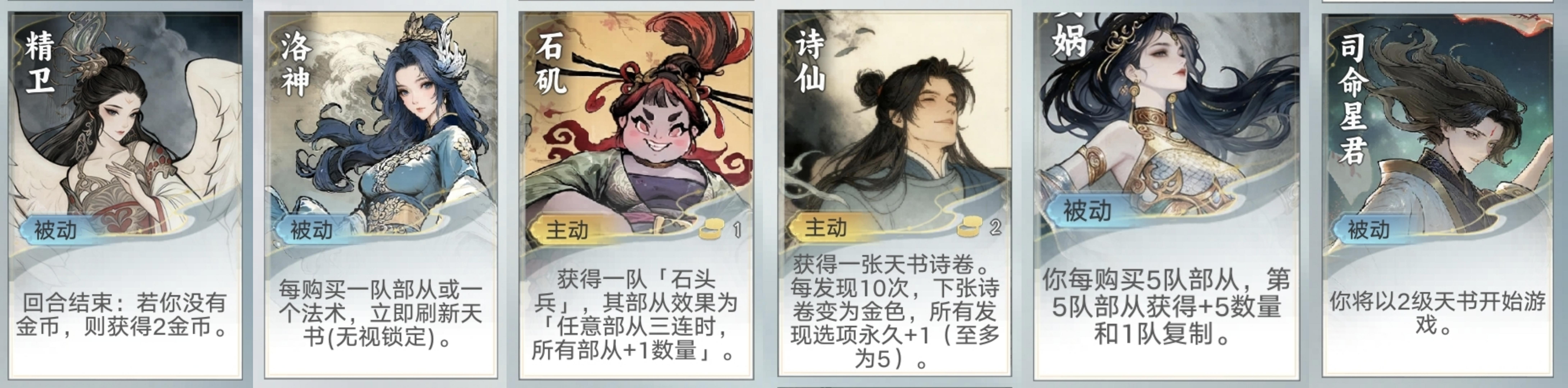 诗仙(这次新加的幻神,白虎的下位替代,主要是白虎能稳定开出刺客,战斗时还有额外属性加成,诗仙也是两金币给一张卡,但实际新太大了,大概率是用处不大的,前期只能用来稍微稳定战力,省点金币速本,后面的提升发现数量,效果有,但也不是很大)