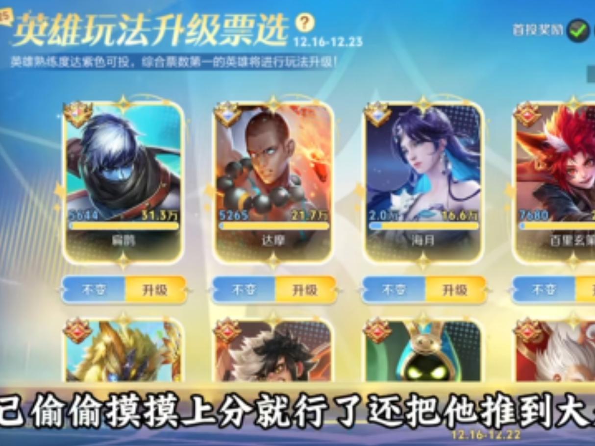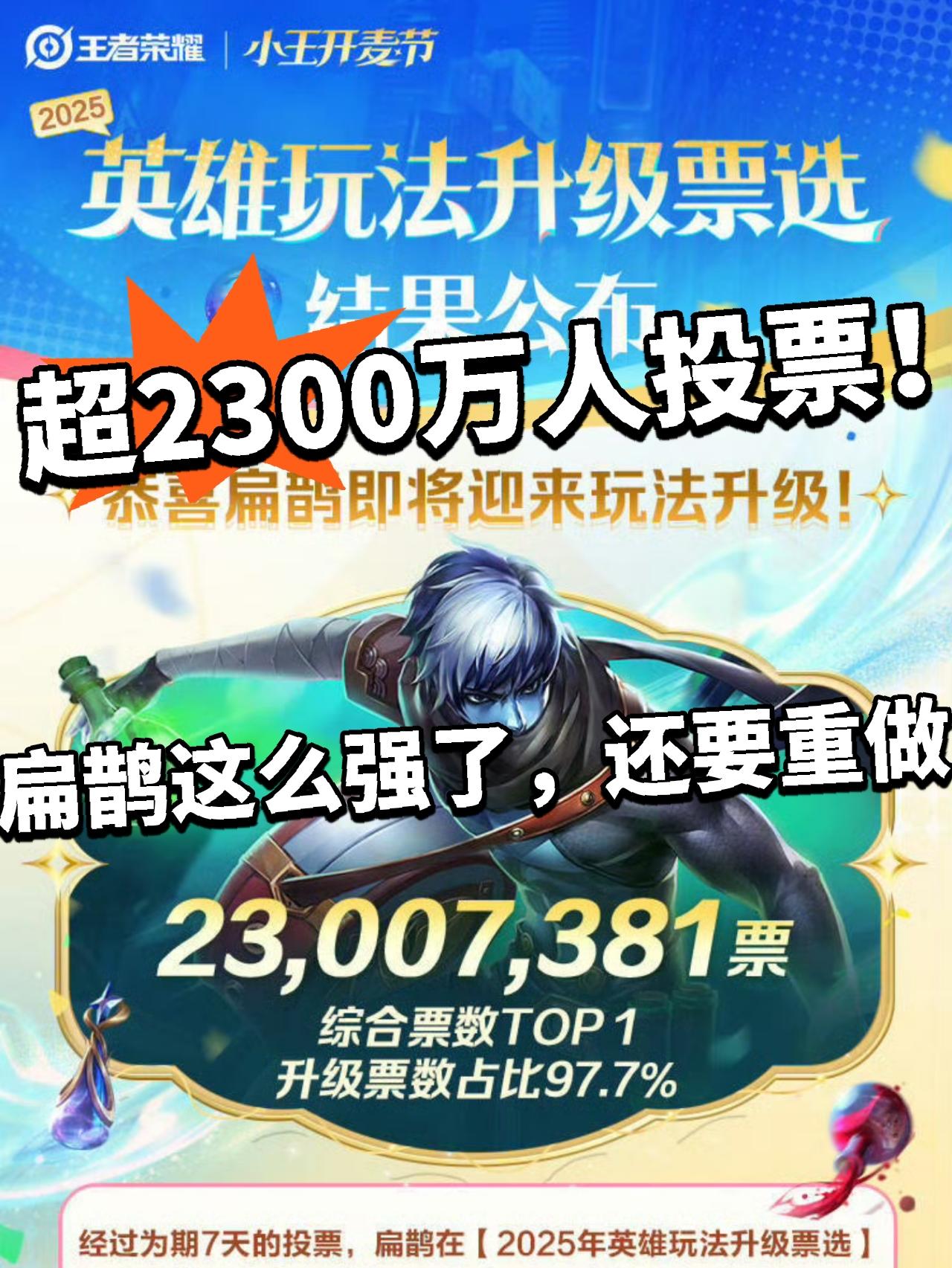 🔥经过7天的不懈努力,每天不停的投票!2025年英雄玩法升级票选 ,扁鹊以2300万票的断层优势拿下综合票数第一,升级支持率高达97.7%,确定2026年要重做玩法,社区直接聊炸了。