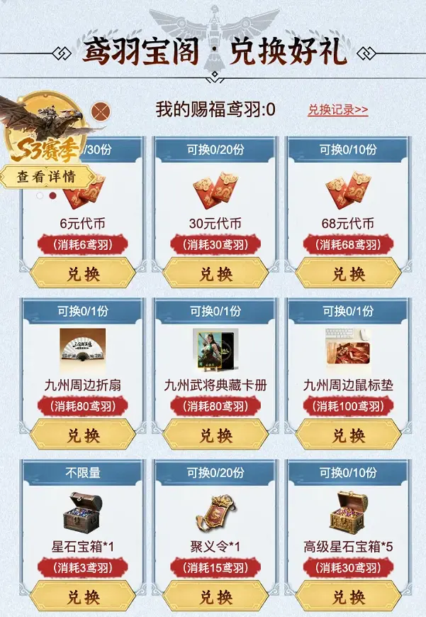 在活动期间,消耗「赐福鸢羽」积分,可兑换聚义令、代币、九州武将典藏卡册等限定实物周边与海量游戏资源!部分奖励数量有限,换完即止!