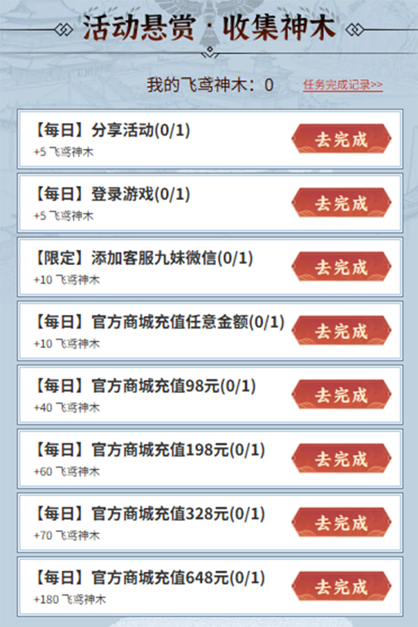 (福运空投、活动悬赏、贡献神木、鸢羽宝阁)