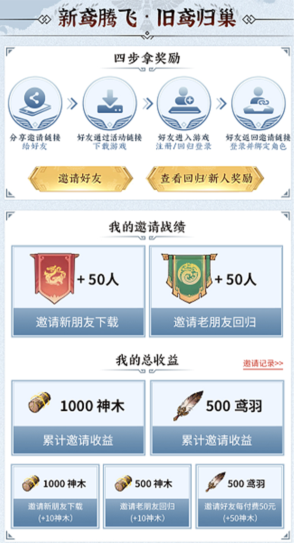 呼朋引伴,共赢豪礼!活动第二阶段开启后,邀请新玩家下载注册或流失14天以上老友回归,每成功邀请1人,邀请人将获得100点「飞鸢神木」积分!受邀好友游戏内每充值50元,邀请人可得10点「赐福鸢羽」积分!叫上兄弟,一起征战,福利加倍!