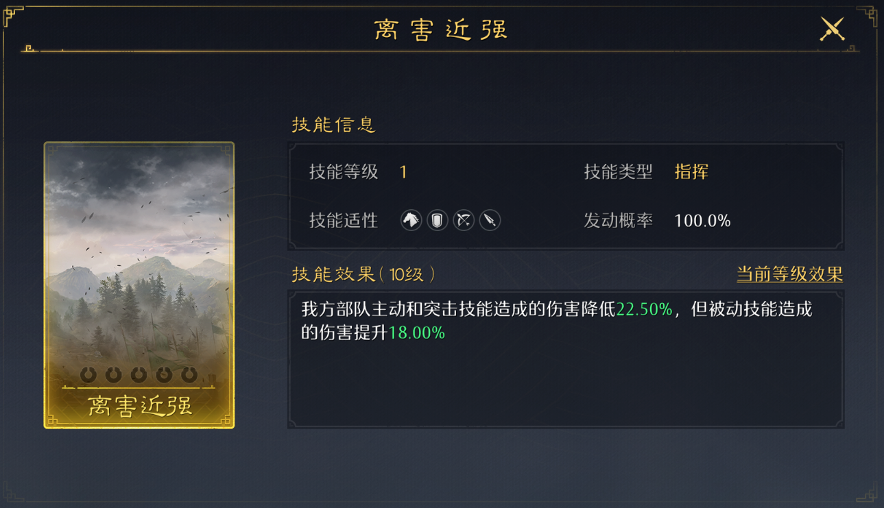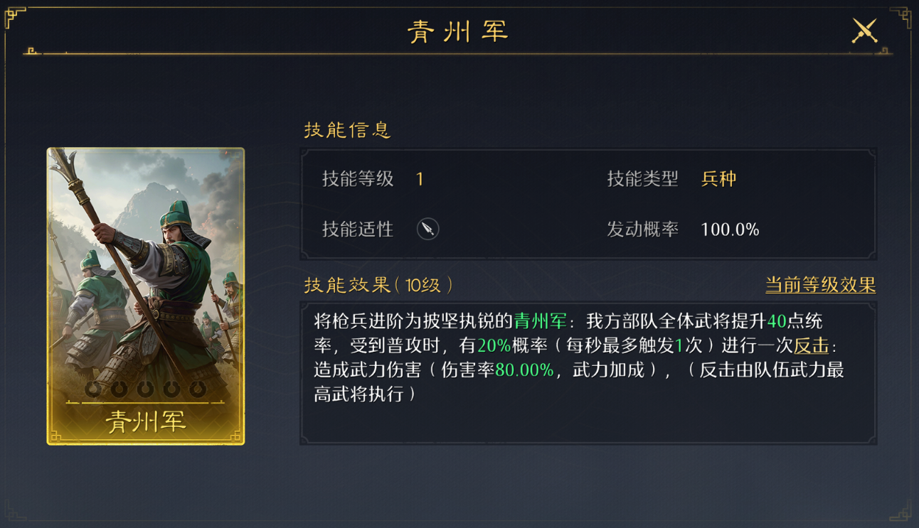 【青州军】:兵种技能,可以提供额外的反击次数以及统率,属于增减伤一体,只要玩枪兵反击必带的技能。