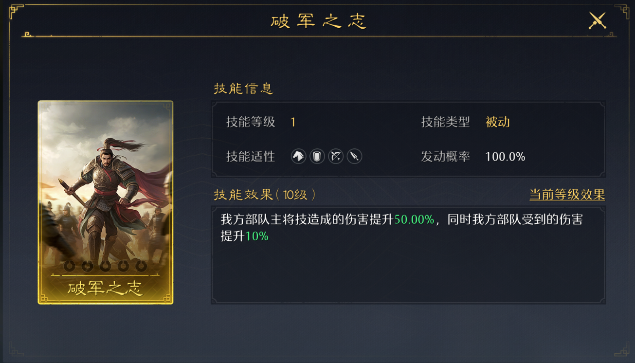 【破军之志】:队伍必备的核心的增伤技能,能够显著提升主将技的伤害。
