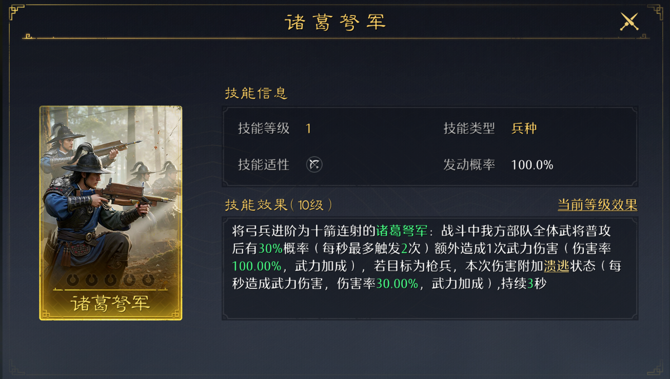 【诸葛弩军】:不同于骑兵突击队的高爆发,弓兵突击队携带此兵种后可以依靠持续伤害来进行输出。