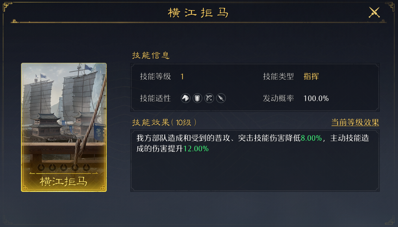 【横江拒马】:主要用来提供增伤,武力和智力输出的主动队都可以携带,增伤稳定,且全队生效,目前没有下位替代战法,【辅国】只能弥补增伤,但是无法解决减伤问题。