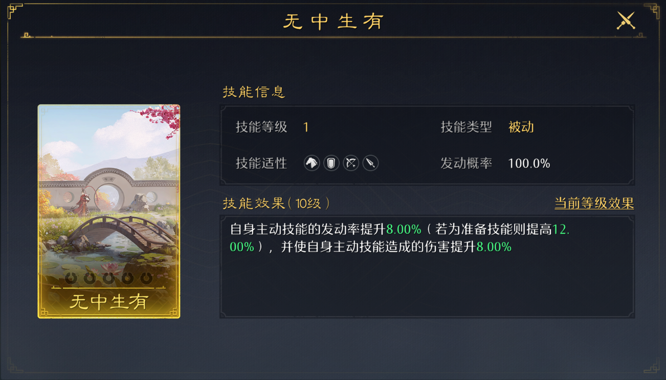【无中生有】:被动技能,可以提高携带武将的技能发动率和伤害,尤其适配诸葛亮这类自身发动率较低、但是自带技能强力的武将。