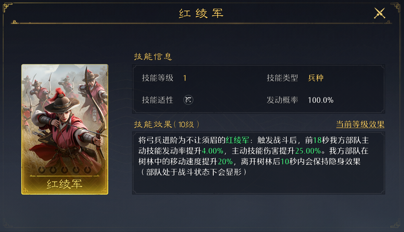 【红绫军】:兵种技能,推荐野战打架的弓兵携带,除了提供发动率和伤害外,在树林中的加速和脱离隐身效果,特别适合手操进行风筝作战。尤其适合短期内爆发高的主动队伍,比如孙尚香,甘宁,以及目前比较热门的诸葛亮无策弓队。