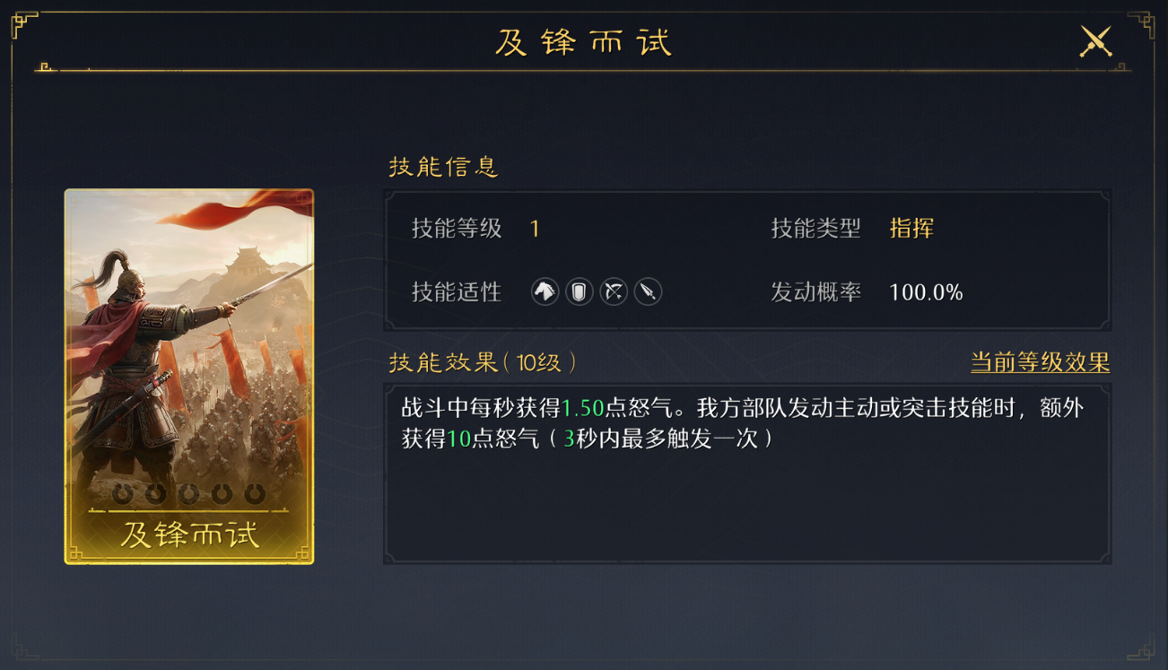 【及锋而试】:提供持续的怒气回复,可用紫色技能【勃然大怒】进行替代。