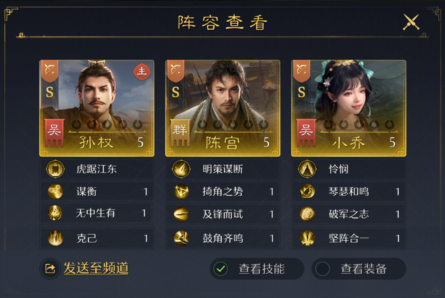 由于孙权的技能需要的怒气较多,使用陈宫+小乔来最大化怒气获取,来达到最快启动。而且小乔本身有减伤,可以更好地提供队伍生存。