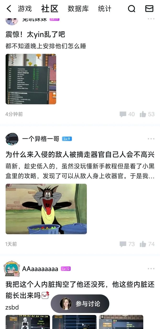 另一款我特别喜欢并深受启发的游戏是边缘世界RimWorld,制作者在模拟经营的底子上加入了独特的设计理念——故事生成器,游戏中每个角色都有自己的背景故事、心情想法、社交关系、生理系统等等,众多人物系统内在交互后指示小人做出不同的行为,结合游戏中其他同样突出的系统设计,让每个玩家每次游玩都能获得不同的独特体验。而边缘世界(由于早期译名影响也叫环世界)最出圈的是“环世界玩家灵活的道德准则”,如果是路人看到这个游戏的社区讨论内容可能会被吓到,因为日内瓦公约大概是老玩家的道德上限,不过这也侧面体现了游戏的自由度极高,每个人可以在游戏中找到自己喜欢的玩法。