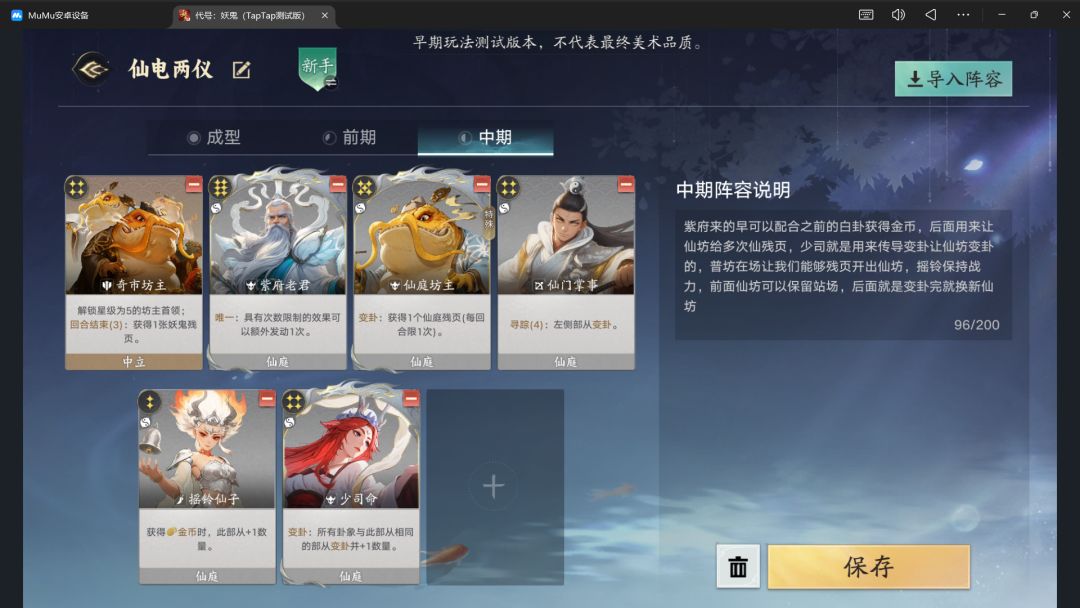 仙坊每次给完三个宝箱就走,场上一定要铺满两仪,天尊要合金将夸父和普坊变成两仪,如果有妖可以留个狰妖,当其它牌三连就有格子,一次性把夸父和普坊都变成两仪