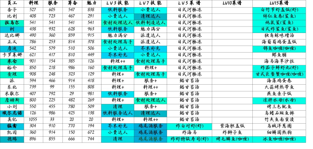 近期不少小伙伴反映想升级店铺等级,但不知道哪些员工提升等级后可以解锁新菜谱,因此这几天新开了个档测试后 ,整理出来了下表内容: