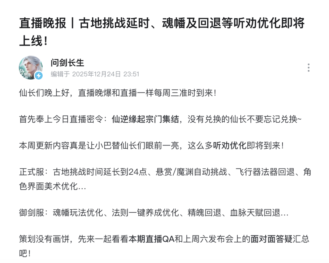 而这种诉求,也深刻影响了《问剑长生》的运营思路,并让他们形成了一套「听劝」哲学。