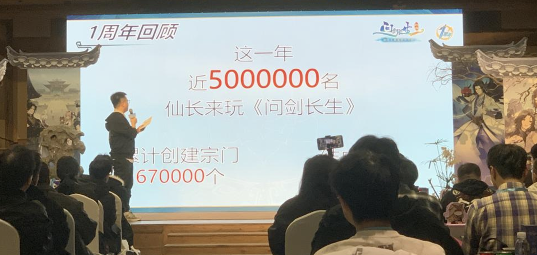 他背后的PPT,是游戏过去一年的成绩:更新了六个大版本,注册玩家近500万。