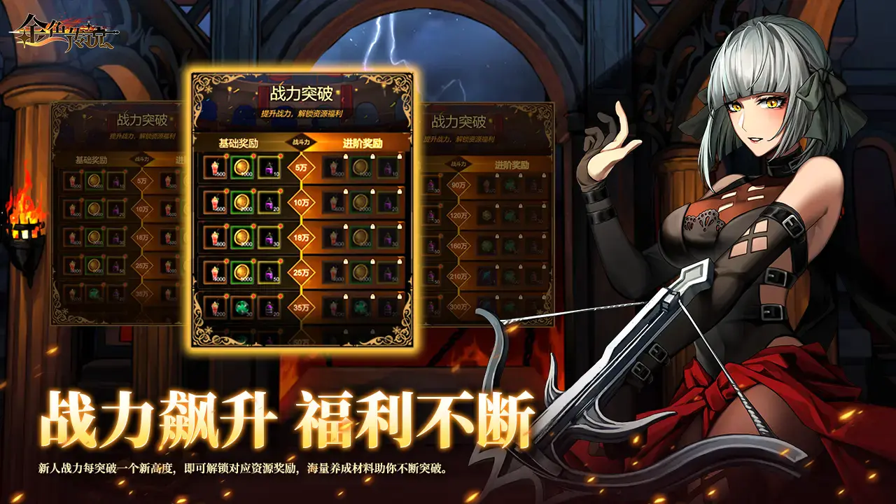 突破自我,福利不停!角色达到指定等级即可领取丰厚钻石奖励;战力每突破一个新高度,即可解锁各种成长资源,助您畅游暗金世界!(角色达到33级后,可在“商店-福利活动”中领取)