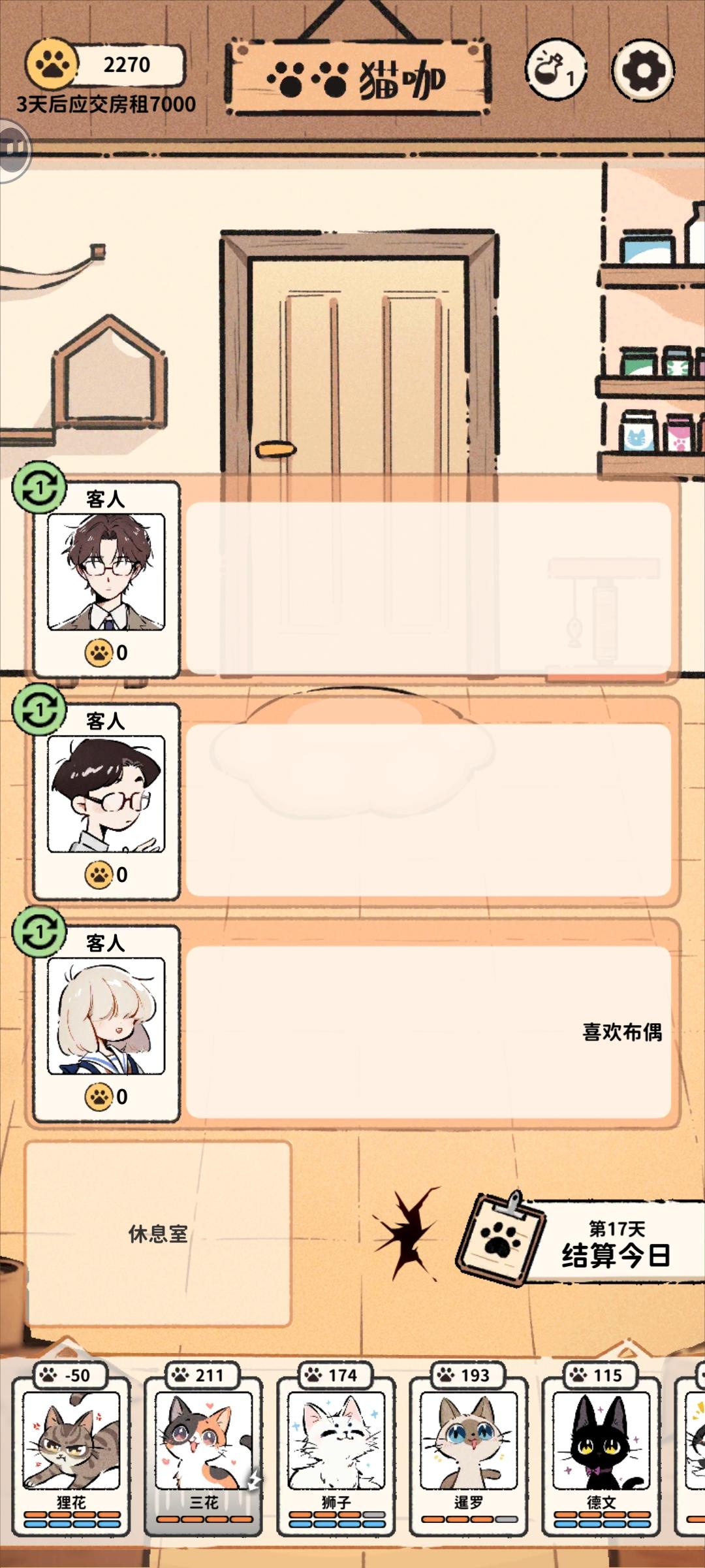 最后随便把暹罗猫和德文放在休息室,啥也没干呢,就直接通关了,影子怪刚刷就结束了??我就是随便放的啊啊啊