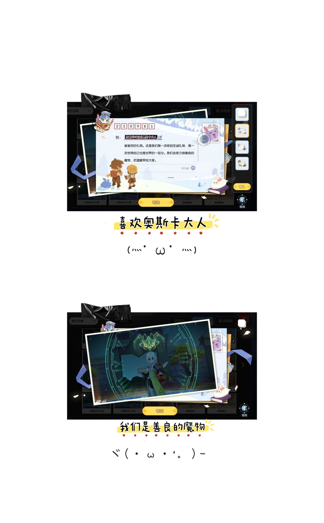 谢谢您送的礼物。这是我们第一次收到圣诞礼物,第一次觉得自己也是世界的一部分。我们会努力做善良的魔物,也希望有一天能像您一样,把温暖送给别人。