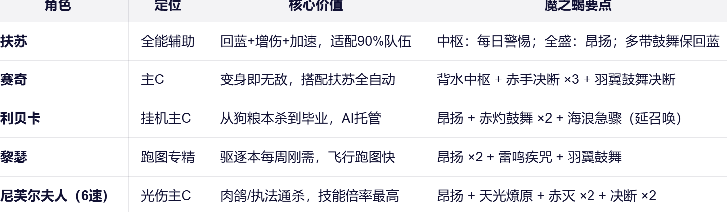 1.1 版本的核心是优先培养 T0 级人权角色,尤其是扶疏、赛奇、利贝卡,能让你轻松应对所有玩法。T0.5 以下角色按需选择,避免前期资源浪费。