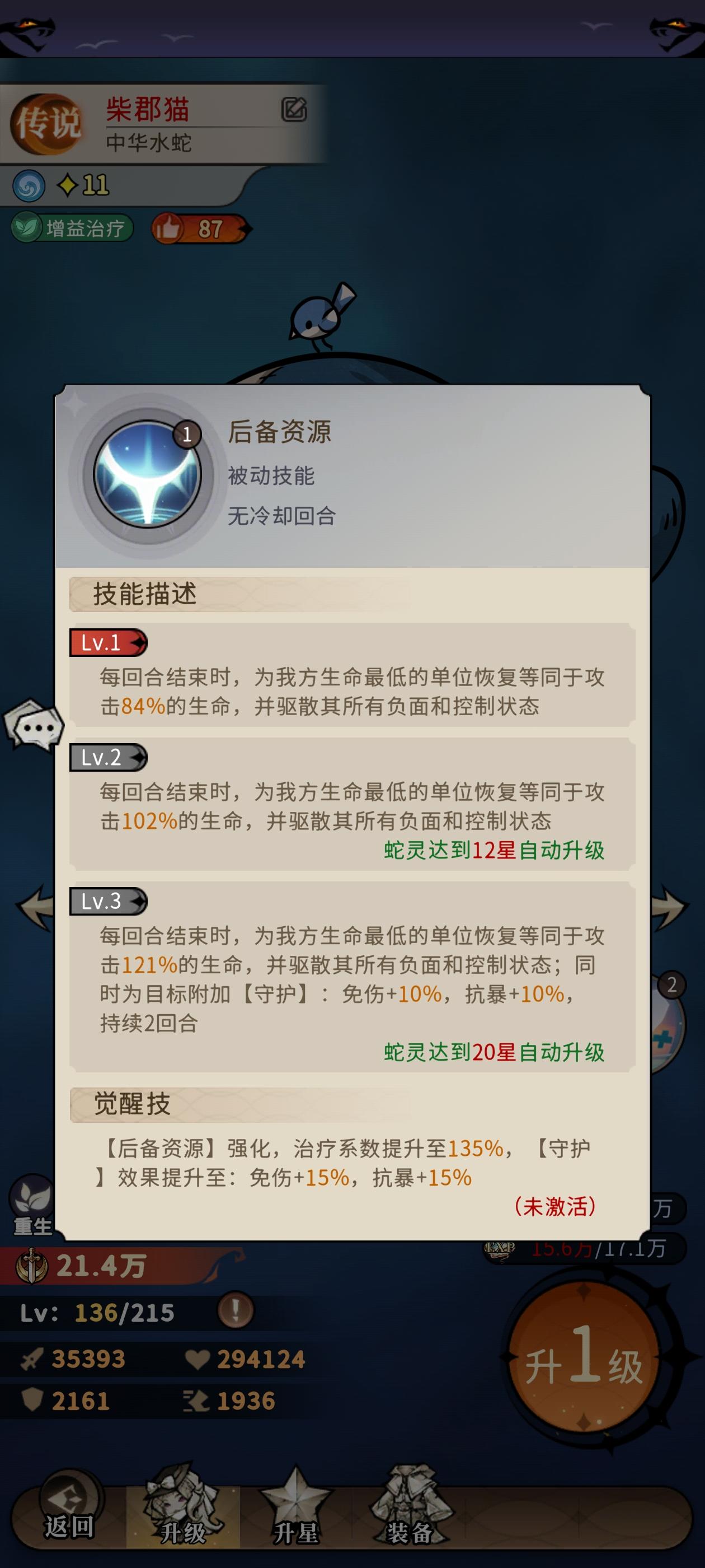 都是换皮的滚服游戏,这张卡的技能机制在闪烁和武魂里面都是顶级存在(刚开服)在这游戏只在传说太可惜了,加攻击加暴击,驱散所有负面和控制在传说卡里应该是最超模的了,推荐各位养一只(传说最多13星,超过就当不了狗粮了)