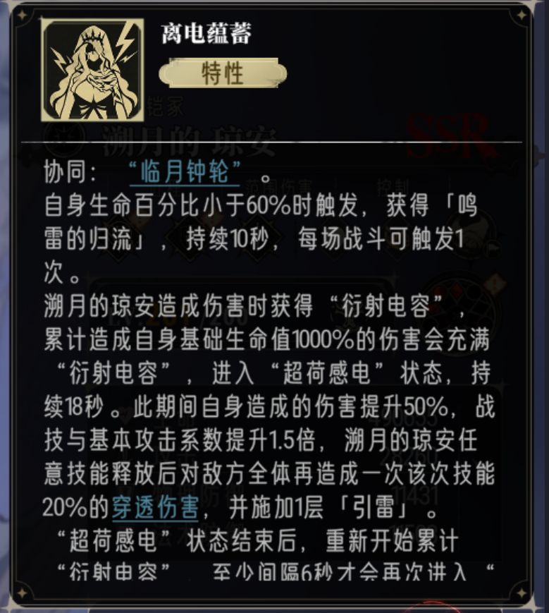超荷感电:始祖琼安要先造成基础生命值1000%伤害才能获得超荷感电状态,启动节奏稍慢(与攻击敌人数量有关),在此状态下会提升50%伤害、并且战技、普攻可按1.5倍攻击数值计算伤害。超荷感电期间发动战技、奥义可造成全体穿透伤害及引雷,18秒大概可以触发3-4层引雷,3层引雷可触发1秒眩晕。