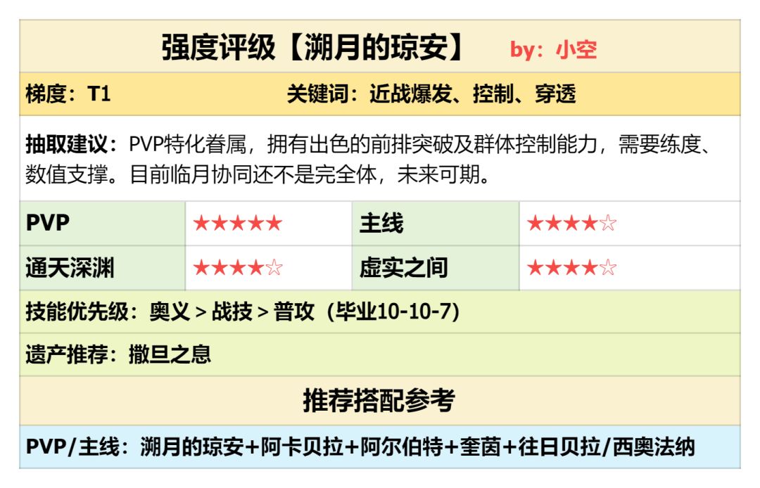 始祖琼安拥有极强的前排突破能力,还能多频触发眩晕效果,是PVP模式的特化英雄。目前推荐以上配置,阿卡贝拉提供回能、暴击率提升,阿尔伯特提供治疗、易伤、禁疗,始祖琼安打控制与伤害。未来临月钟轮如果增加新的协同,强度会得到进一步提升。