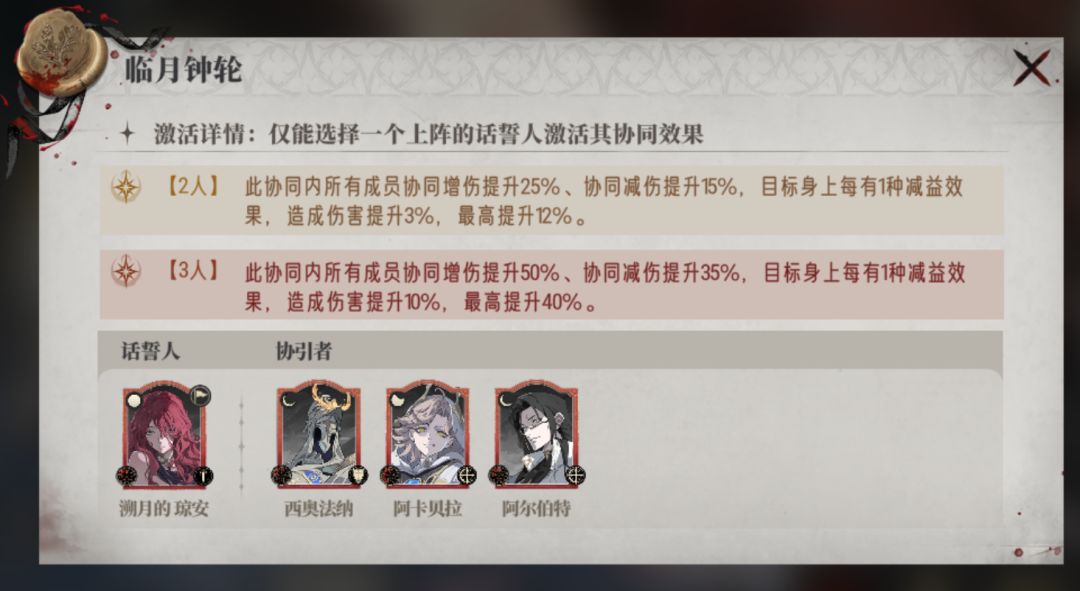 临月钟轮的特殊效果是“目标身上每有1种减益”,可提升成员造成的伤害,相比于其他协同,拥有额外40%增伤。