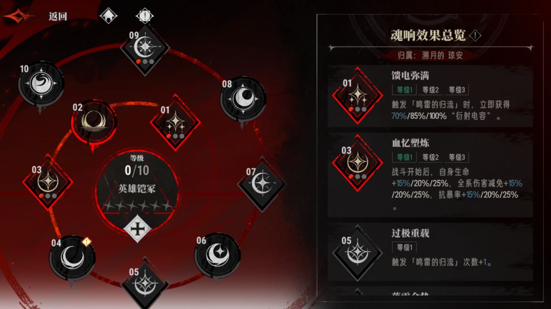 鸣雷的归流:在生命值低于60%时可触发“鸣雷的归流”状态(初始每次战斗限1次,啖魂5增加1次),获得10秒免控、免受所有伤害、提升30%暴击率,此机制可提供额外容错,在竞技场中有特化效果。