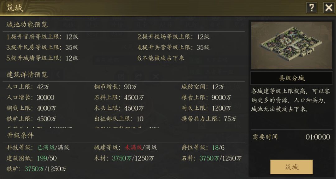 筑城条件:城内所有科技满级、所有建筑满级(包含四项资源建筑50级)可以开启,分城筑城需要建筑图纸,主城不需要建筑图纸
