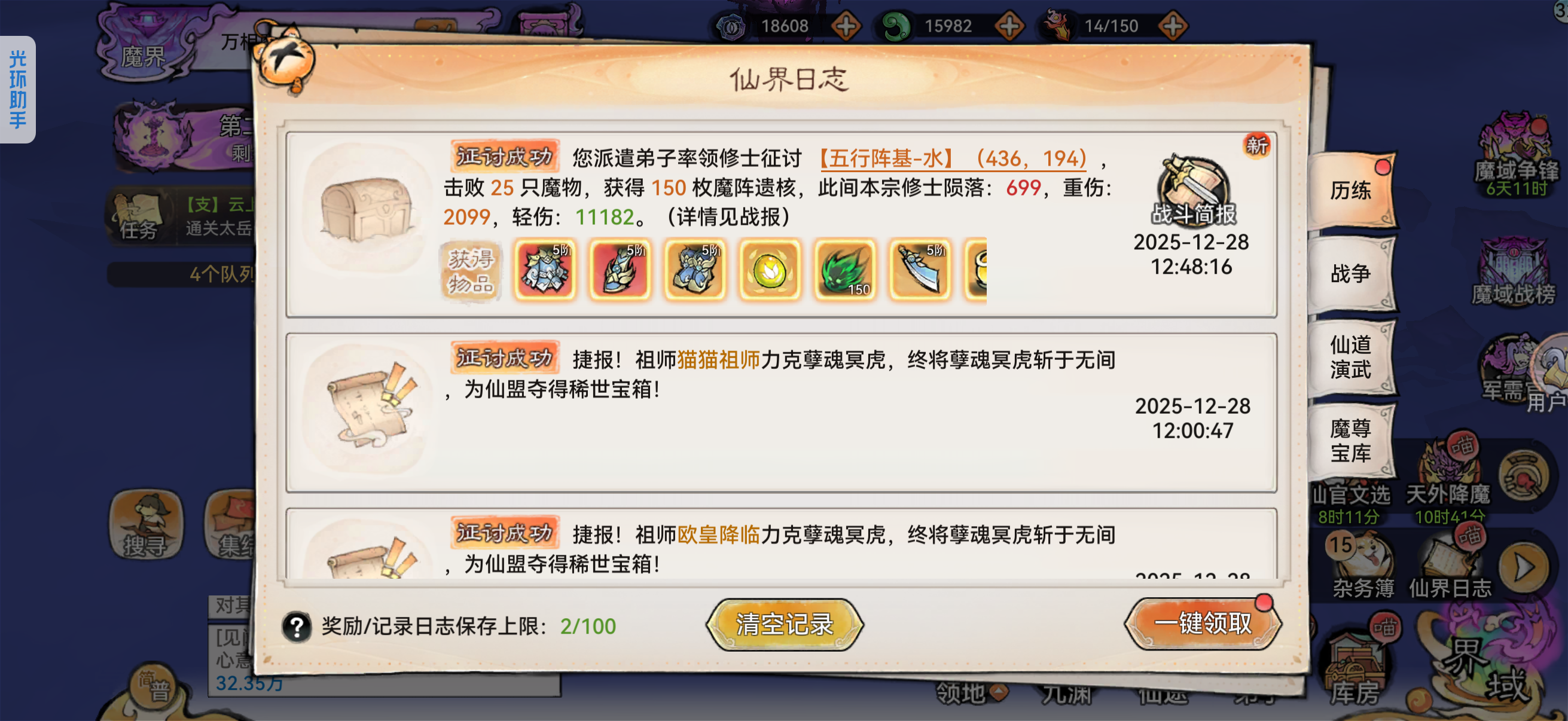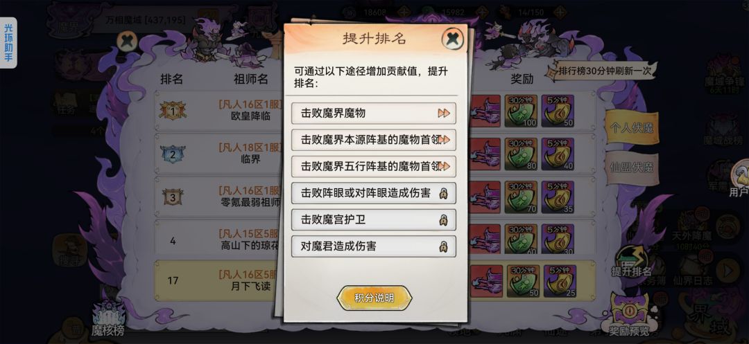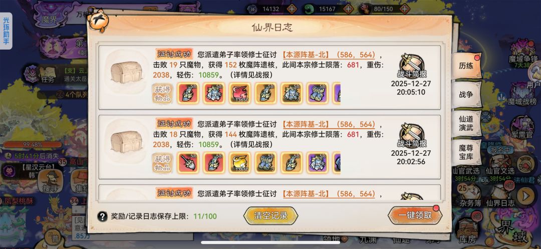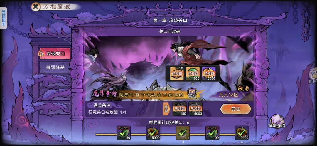 (3)破关关键:先破门不要怕损兵,兵没了就边打边治疗。正常5个满合体兵就能磨掉;首破仙域有额外四阶材料、斩魔道勋。