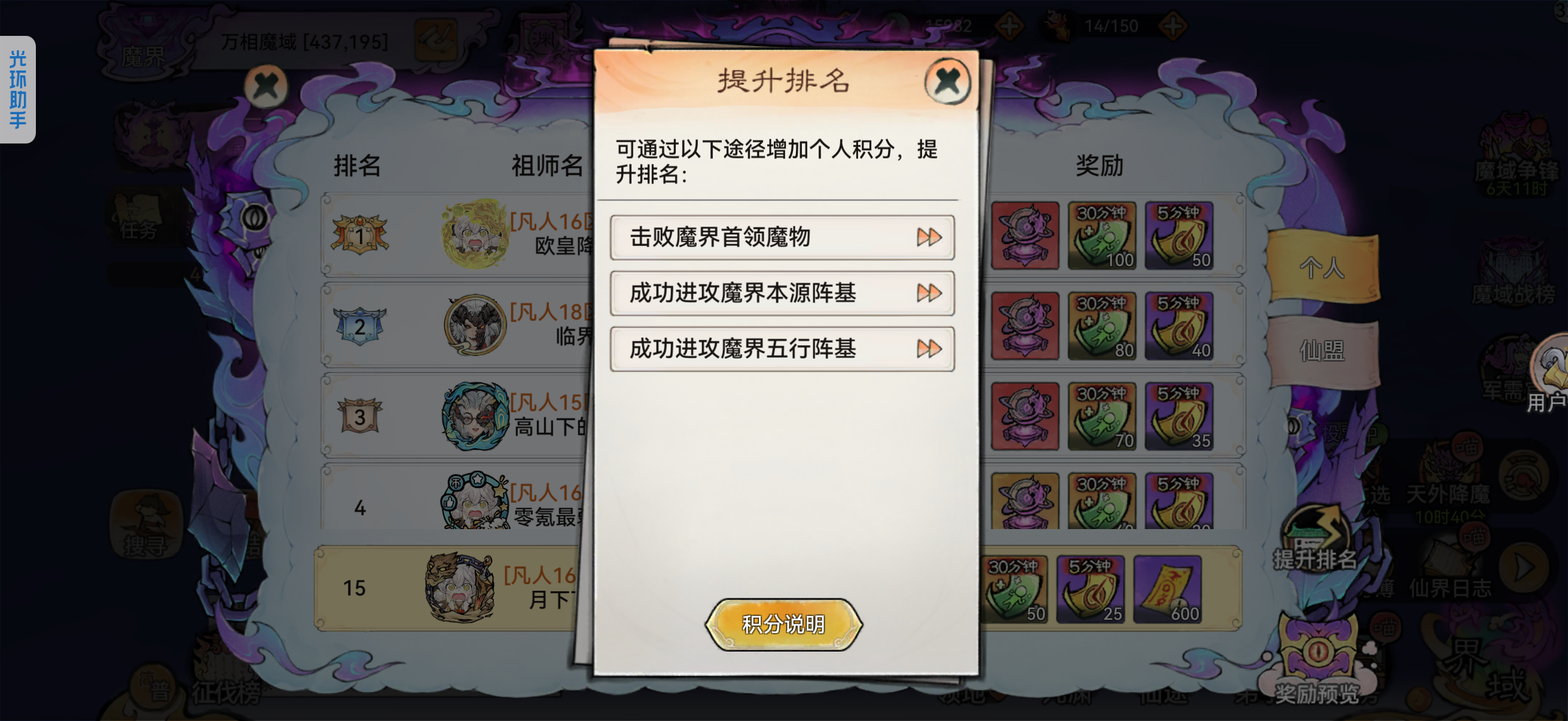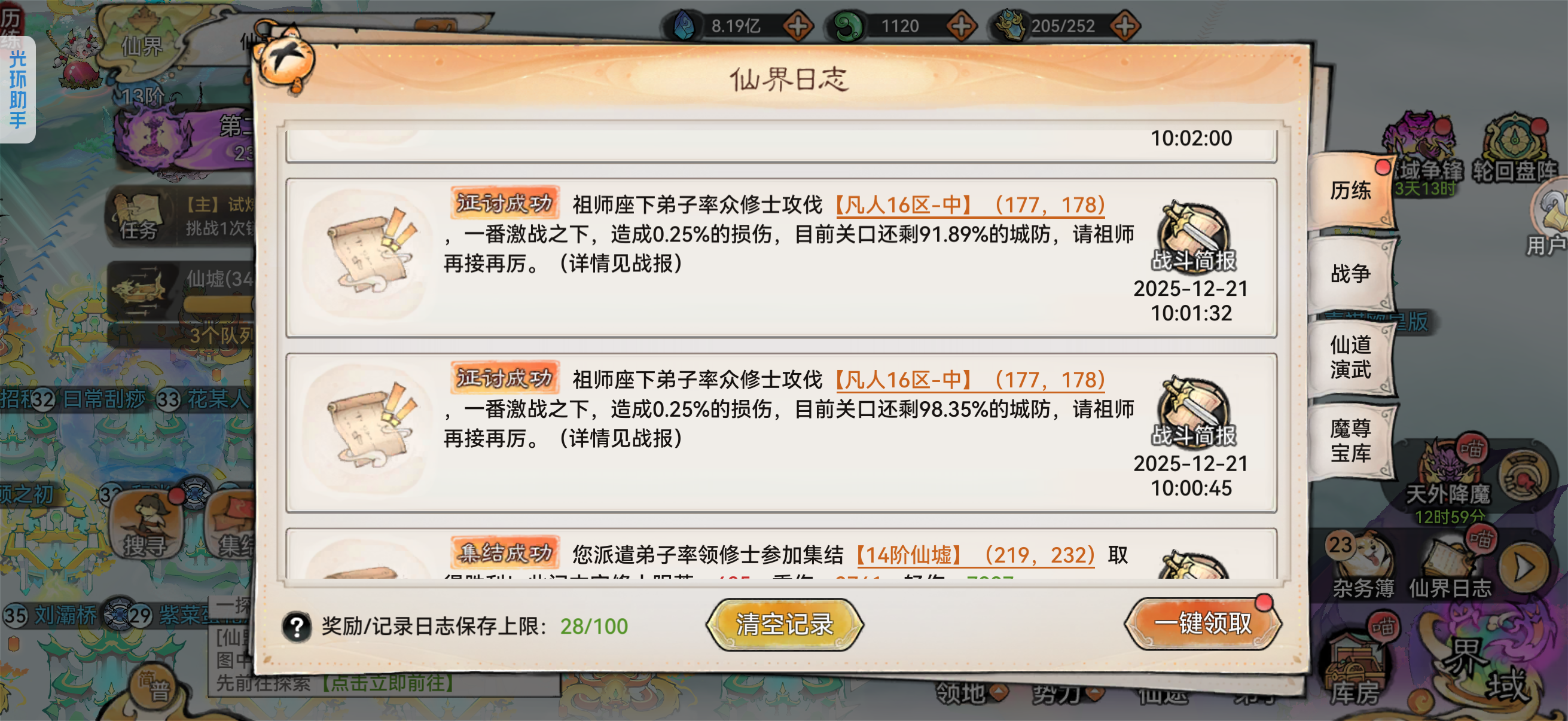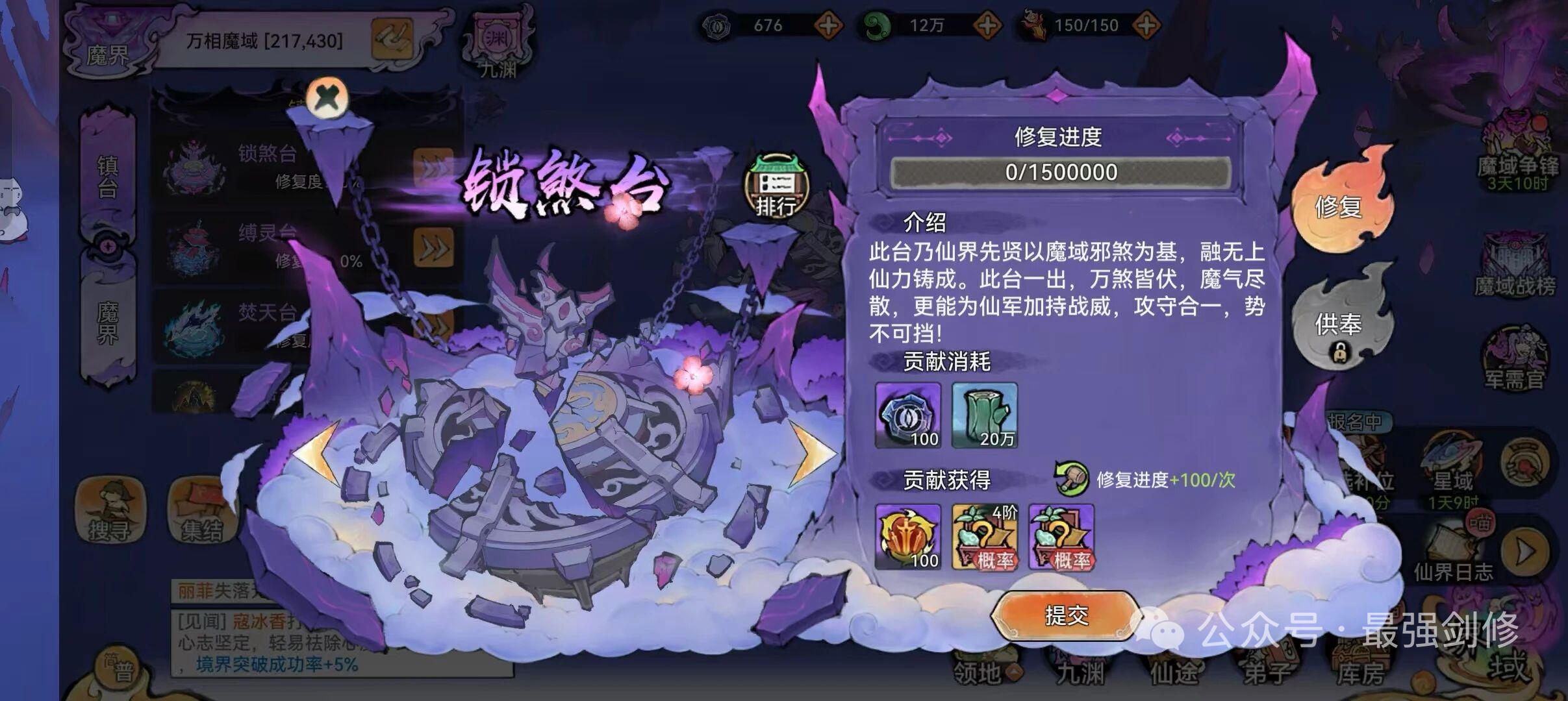 (3)破关关键:先破门不要怕损兵,兵没了就边打边治疗。正常5个满合体兵就能磨掉;首破仙域有额外四阶材料、斩魔道勋。