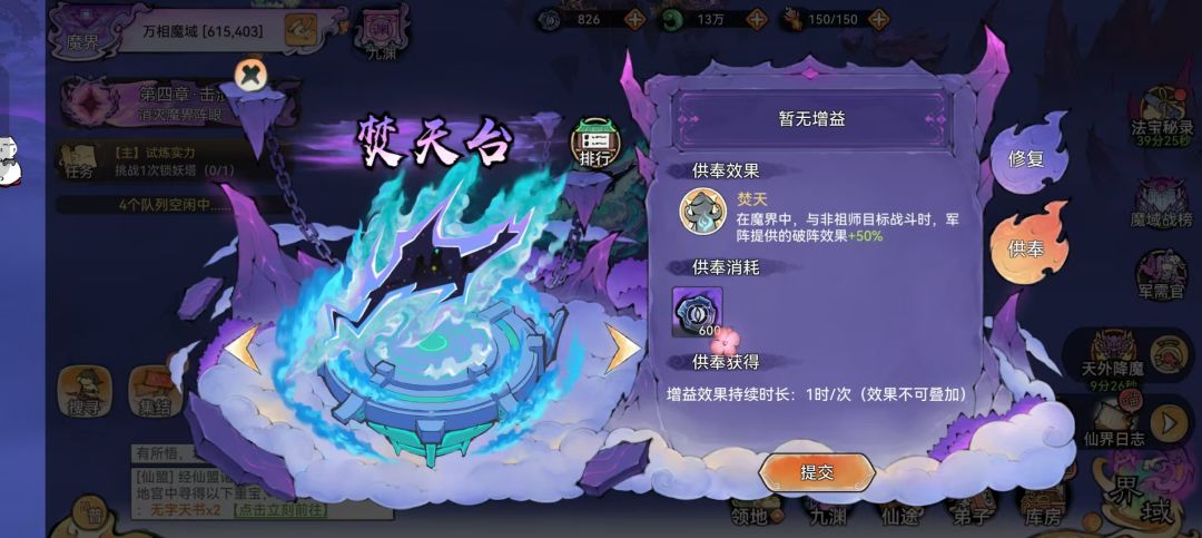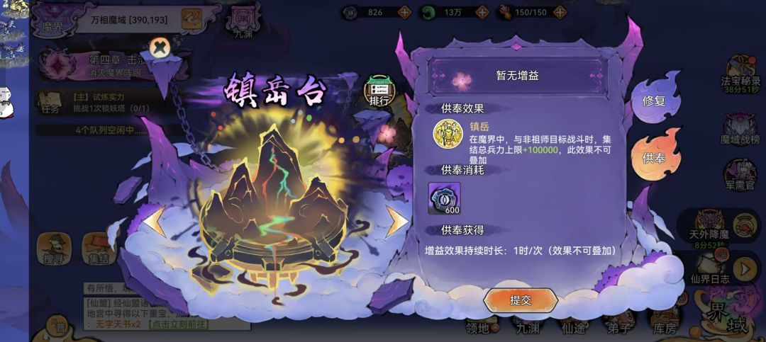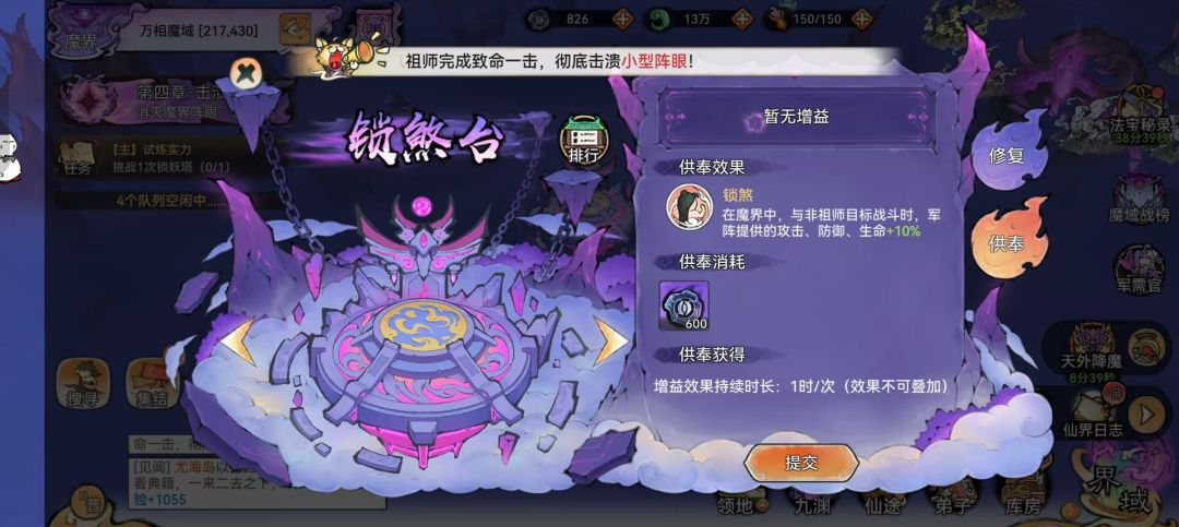 (2)章节奖励:完成本章节后,将解锁 “镇台供奉” 功能。祖师可在此功能中继续消耗魔晶,换取各类增益效果。奖励斩魔道勋,有概率开到四阶材料。
