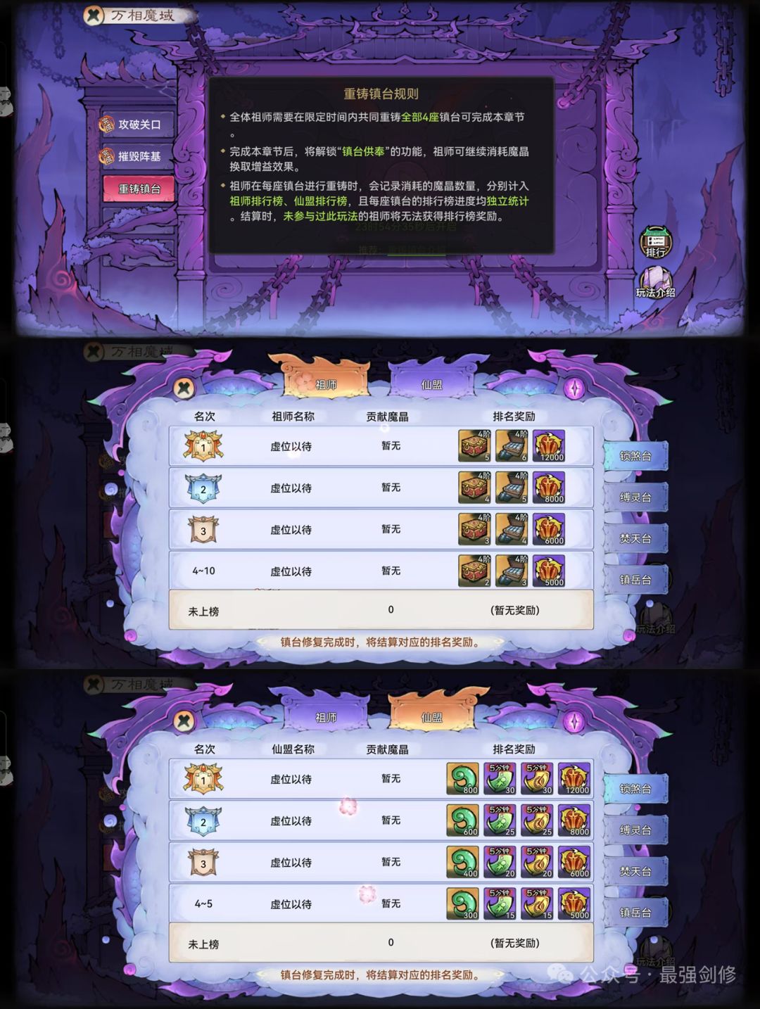 (4)重要提醒:结算时,未参与过本章节玩法(即未在任何镇台进行过重铸)的祖师,将无法获得排行榜奖励。