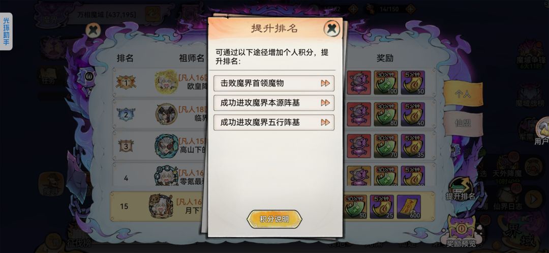 (3)破关关键:五行阵基打满25只可得150魔核,第一根本源柱子打满可得200魔核,难度简单,用正常的仙墟蛊队阵容都能打满,从第二根本源柱子开始被拉开差距(打满50只,每一只怪换算8个魔核,跟氪佬开始差距明显)。合体兵跟大乘兵差距开始拉开,氪佬每天的8次大概可以平均1次拉开15-20个怪的差距,计算大概15x8x8=960到20x8x8=1280分。根据匹配到的仙界情况,大乘兵营数量,可以大概算一下自己能不能抢榜,拉满体力卷起来。(体力不用留在第三章,可以根据规则分计算,第三章是没有个人分的,想要抢榜的人第二章就要梭哈。)集体打满40个五行柱子多一个新仙魔自选箱,魔核榜个人前20奖励1个新仙魔自选箱子。