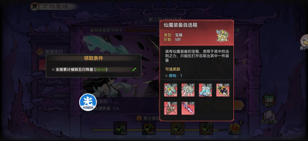(1)攻破关卡目标:集中仙盟力量击破关口,倒计时结束隔天10点抢关卡首破,全盟玩家多领取1个四阶装备箱+300灵玉+5000斩魔道勋章,解锁下一阶段。