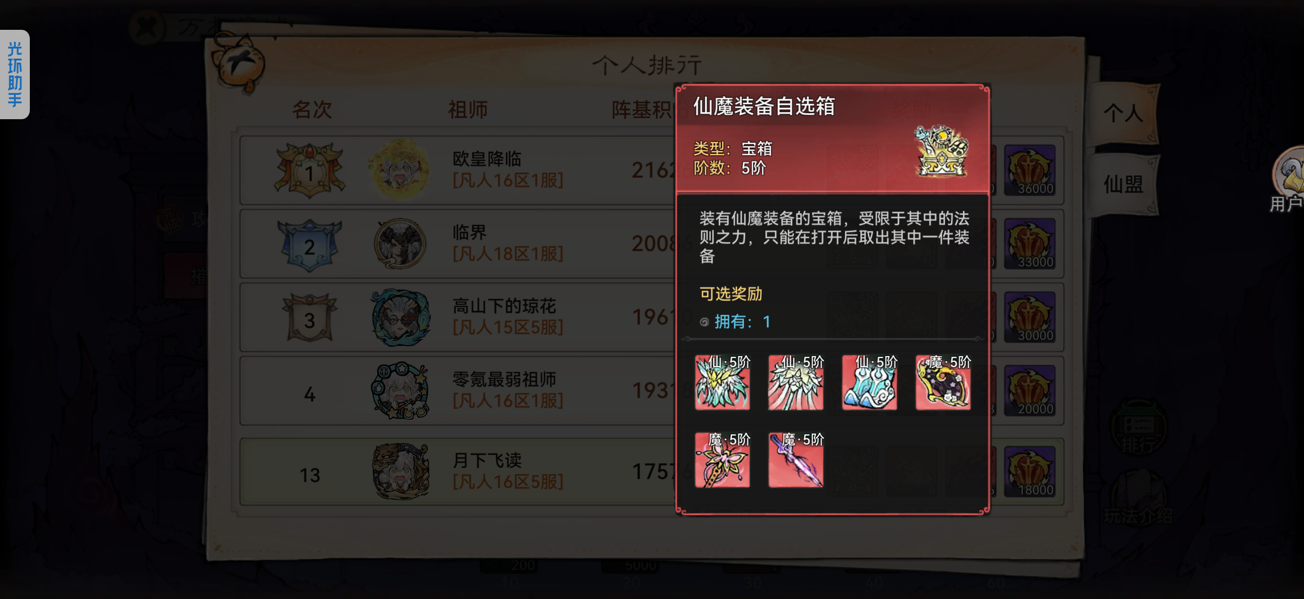 (3)排行榜记录规则:祖师在每座镇台进行重铸时,所消耗的魔晶数量将被分别记录,并同步计入以下排行榜:祖师排行榜(个人排名);第一名5个4阶材料;第二名4个4阶材料;第三名3个4阶材料;第4~10名2个4阶材料;前50名1个4阶材料;仙盟排行榜(仙盟排名);每座镇台的魔晶消耗数据独立统计,并分别进行结算。