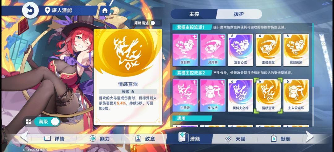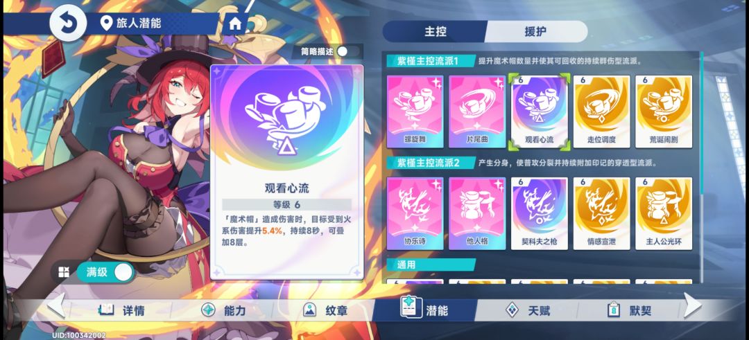 今天才抽的圣菈露。就研究了一下,有个紫槿主控、菈露援护的玩法。我照着作业抄,就感觉不对。这紫槿压根就当不了主控,这给得也太少了,没有一个潜能是给得多的。最多的那个77%火易伤,但是吃大招,且大招30秒。就只有观看心流值得抓而且抓满也就一般偏下水平。这能发挥出来援护位输出哪怕50%的水准吗?