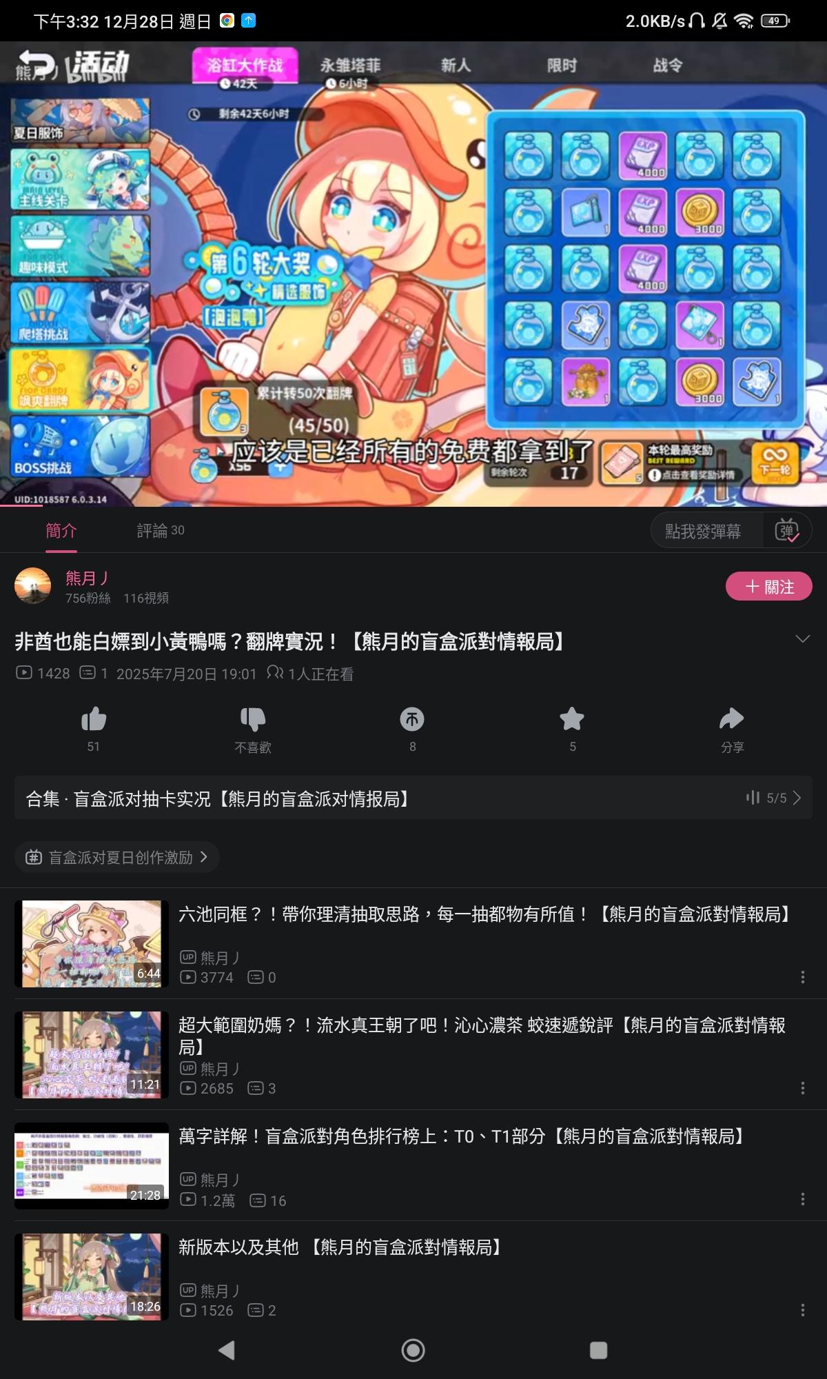第二期(浴缸大作战)的翻牌道具直购变为(1*20+10*5)=70个,变少了但因为补到了爬塔30楼+累消,从别人的影片可以看到可以白拿约99个道具。可见官方把夏活做的像庆典一样盛大,此时官方风评还是不错的