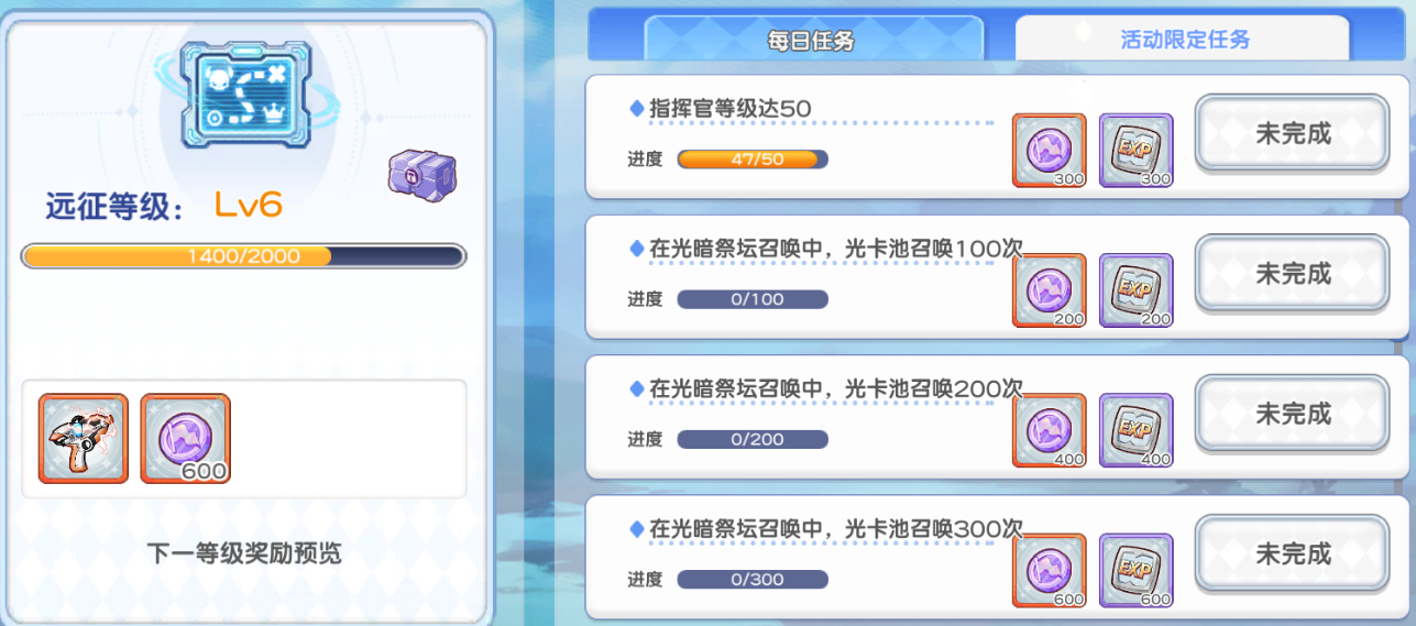 ②远征经验用来升级左侧远征等级,活动限定任务会随远征等级逐步开放。