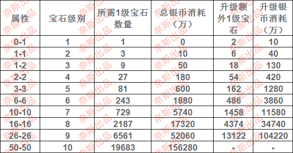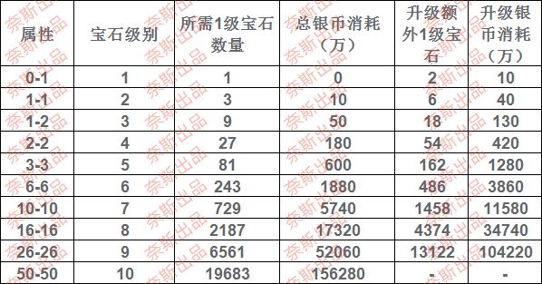 具体等级消耗见图片,图片为单颗宝石消耗和升级消耗。