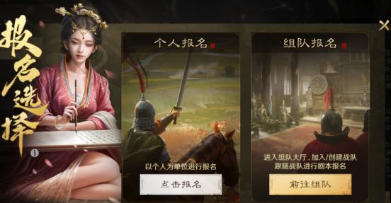 ● 进行剧本选择时,主公可选择「个人报名」和「组队报名」。