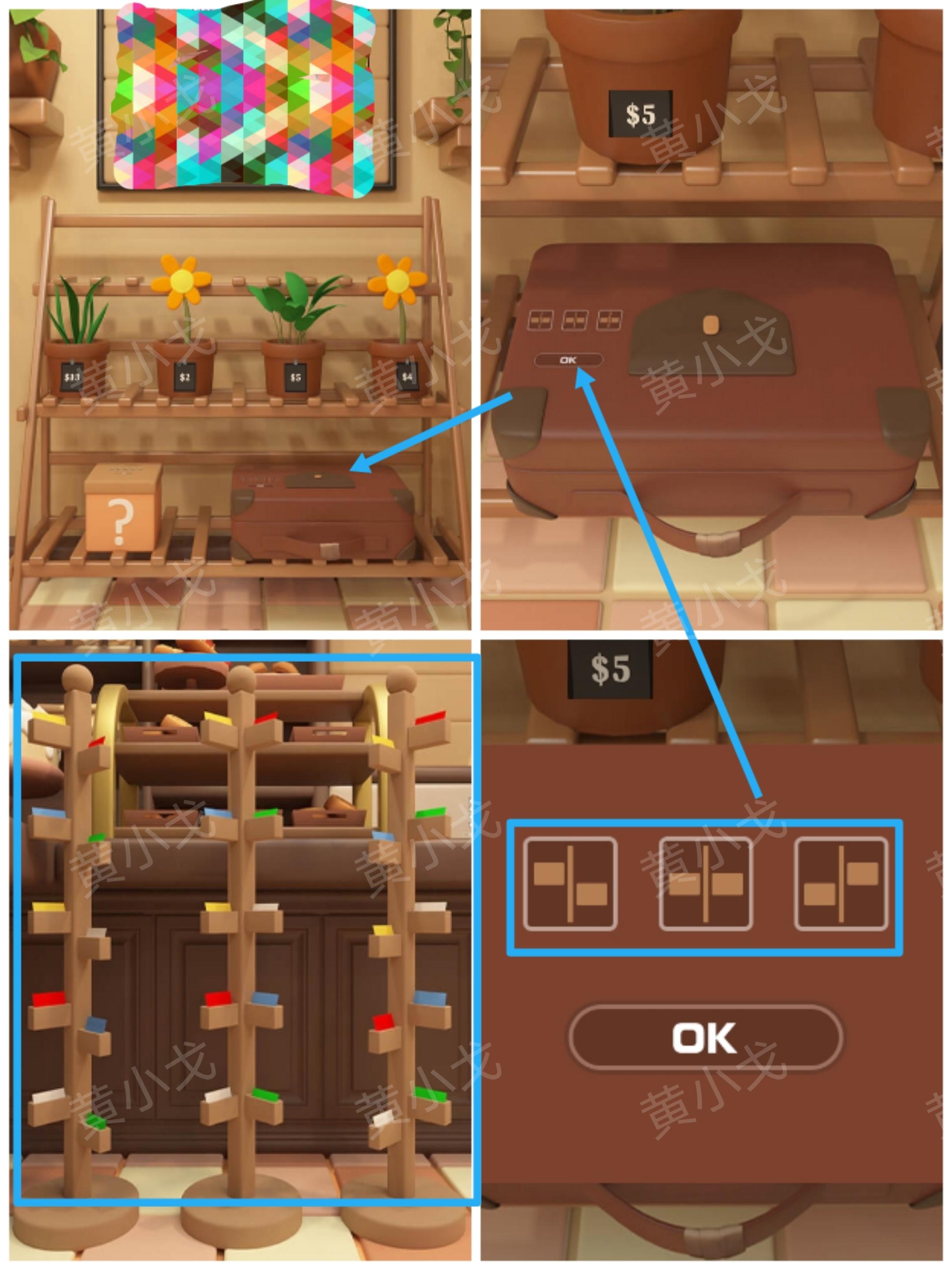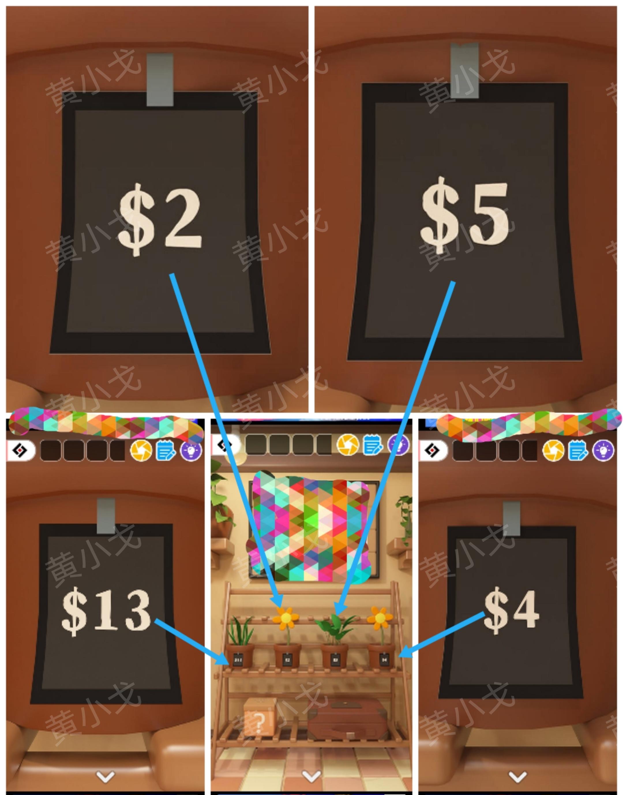 6.点击架子上的盒子上的密码锁,根据上面的数字提示,结合四个盆栽的价格,调整密码锁