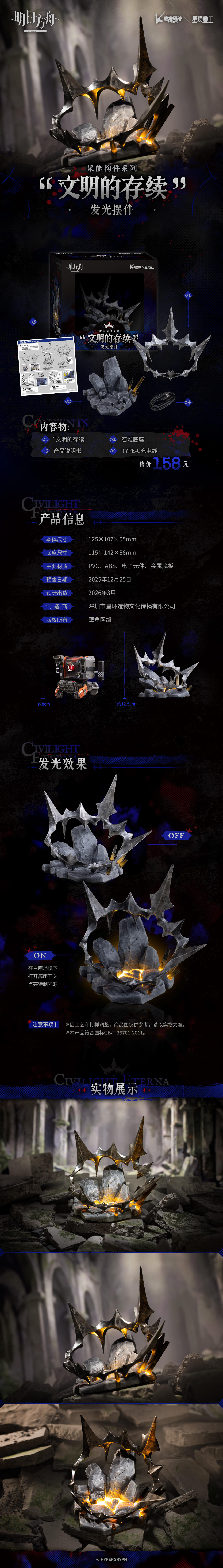 本次推出的【文明的存续】 将采用PVC、ABS、电子元件、金属底板等材料制作,本体尺寸 125*107*55mm,底座尺寸 115*142*86mm,算是比较小巧精致的一款摆件,其他具体内容详见图片。