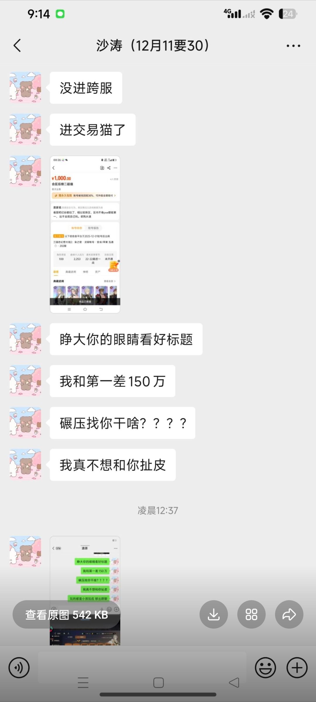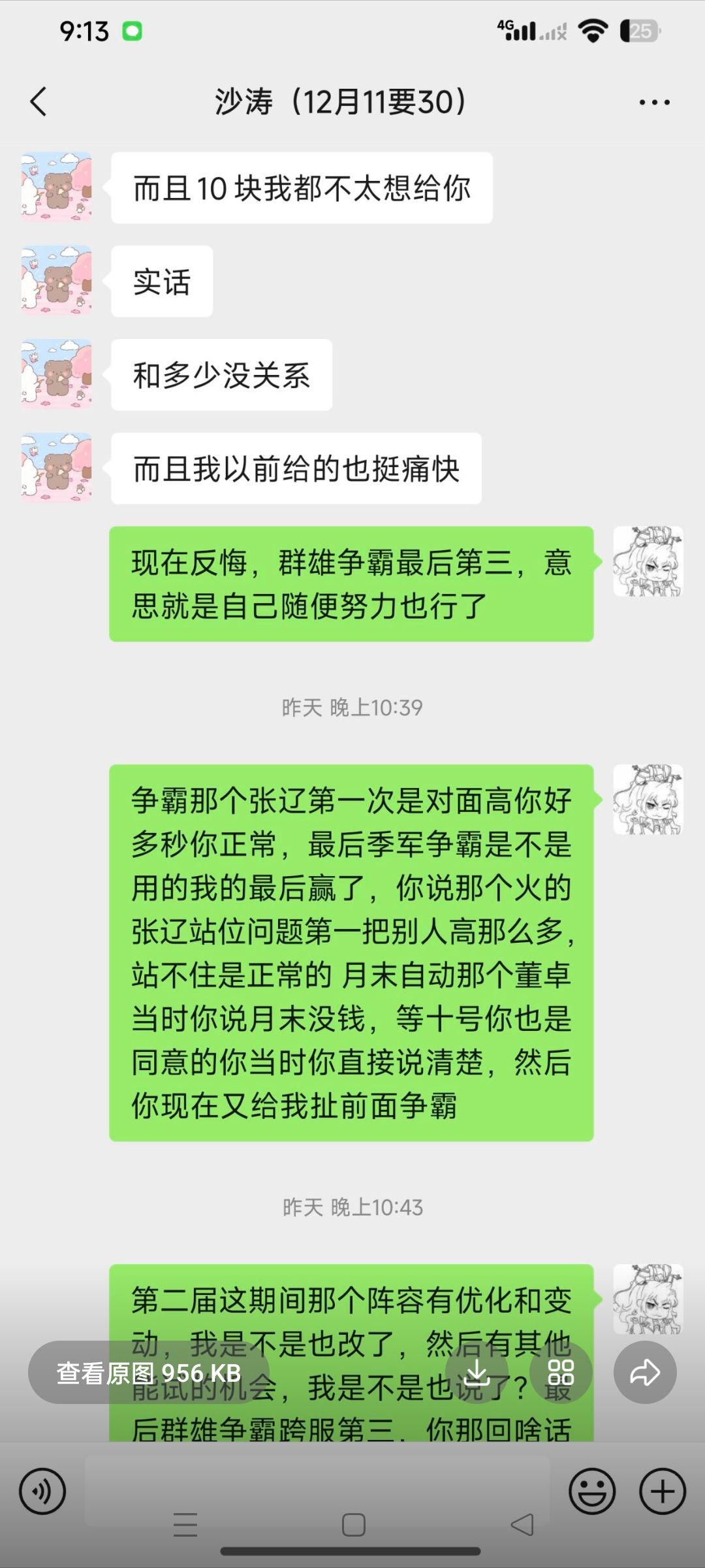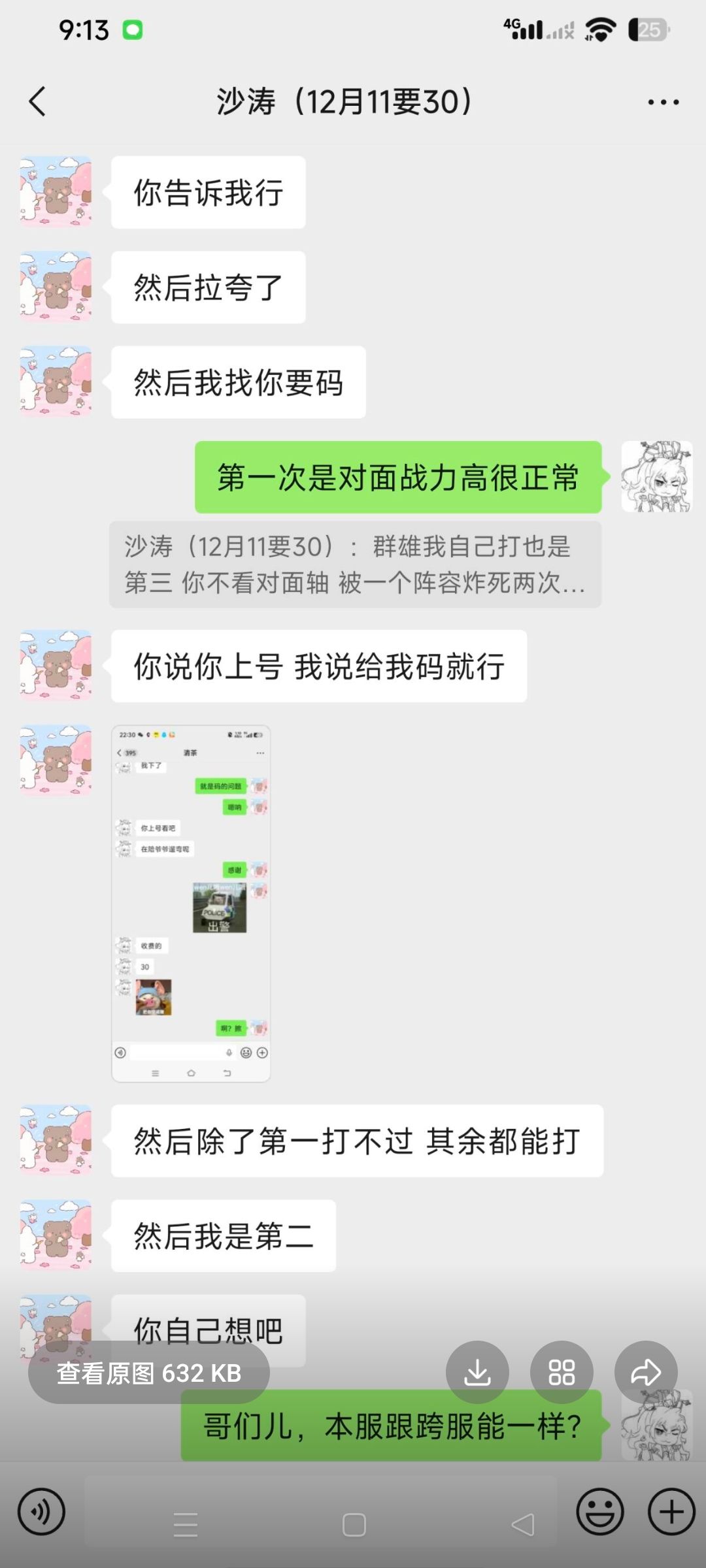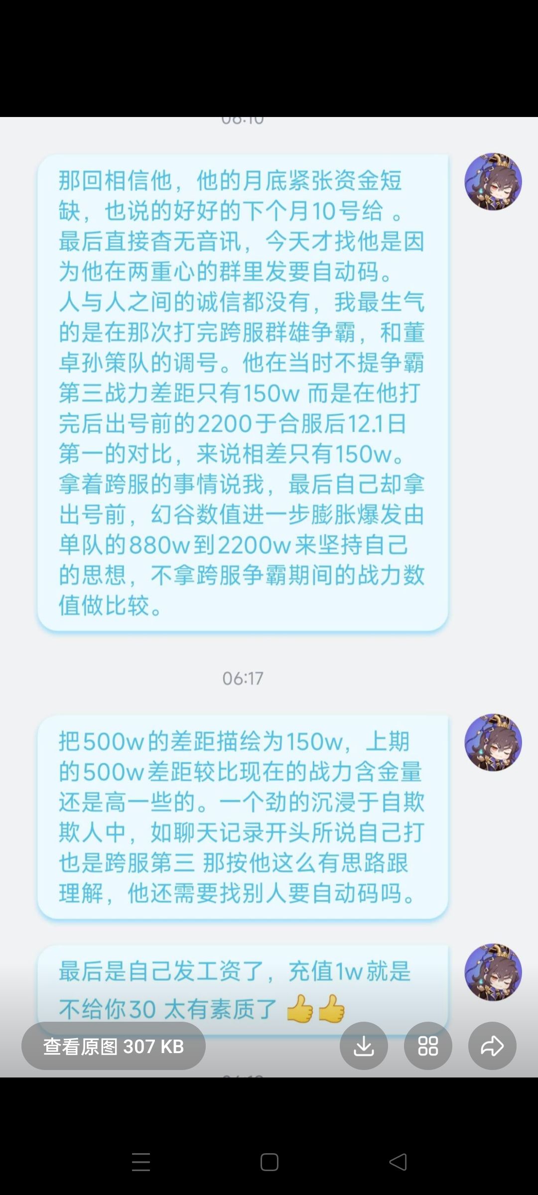 大概意思就是,上次跨服四强碰到第一,八百打不过一千三百万这个确实没办法,季军赛越五十万打赢了对面不结账还找一大堆借口,战力都没进前三的号,后来找他调董卓孙策还是没结账说什么十号发工资,结果就是宁愿氪一万也不结账三十,666