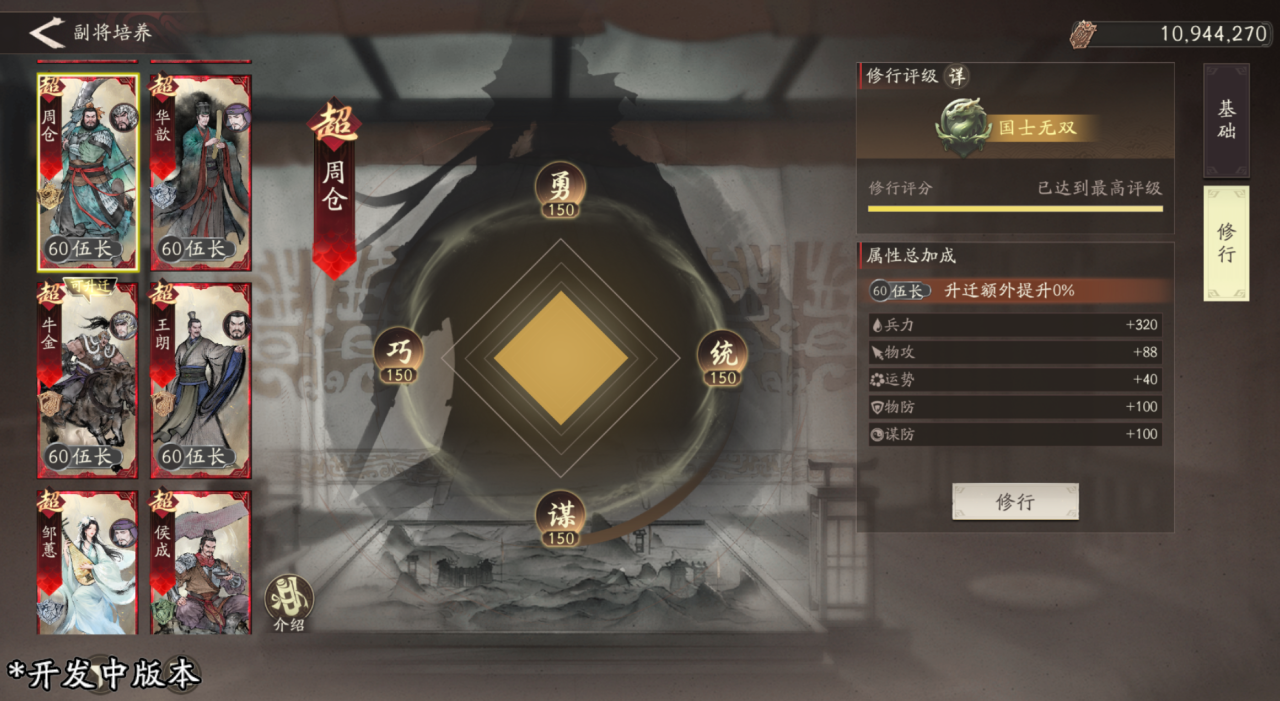 在1.3版本中将开放副将修行系统,每个副将达到55级后开放副将修行,消耗修行精要可大幅提升副将属性。