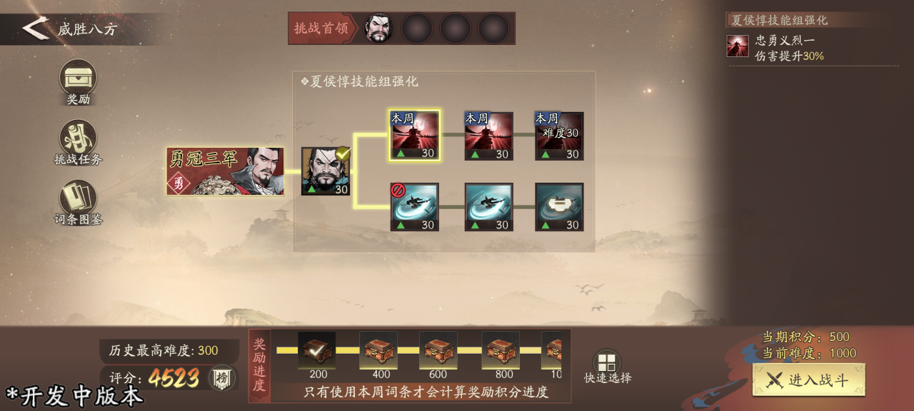 全新周常玩法“威胜八方”即将上线,自由选择词条强化自身或敌军,挑战曹操、刘备、吕布三位作战风格迥异的统帅及其手下将领,根据选择词条的总数获取更高的积分。