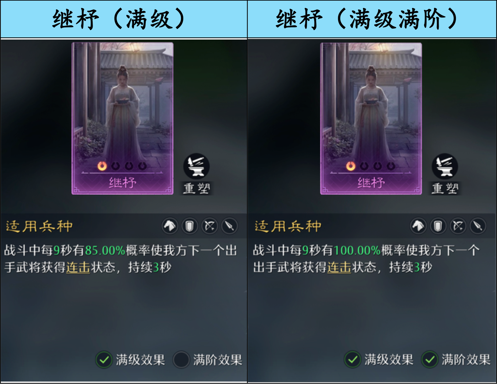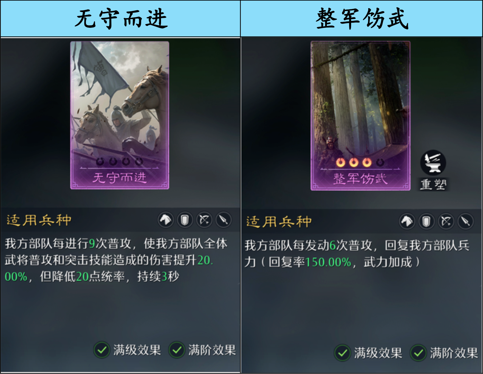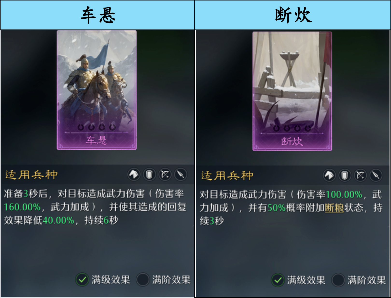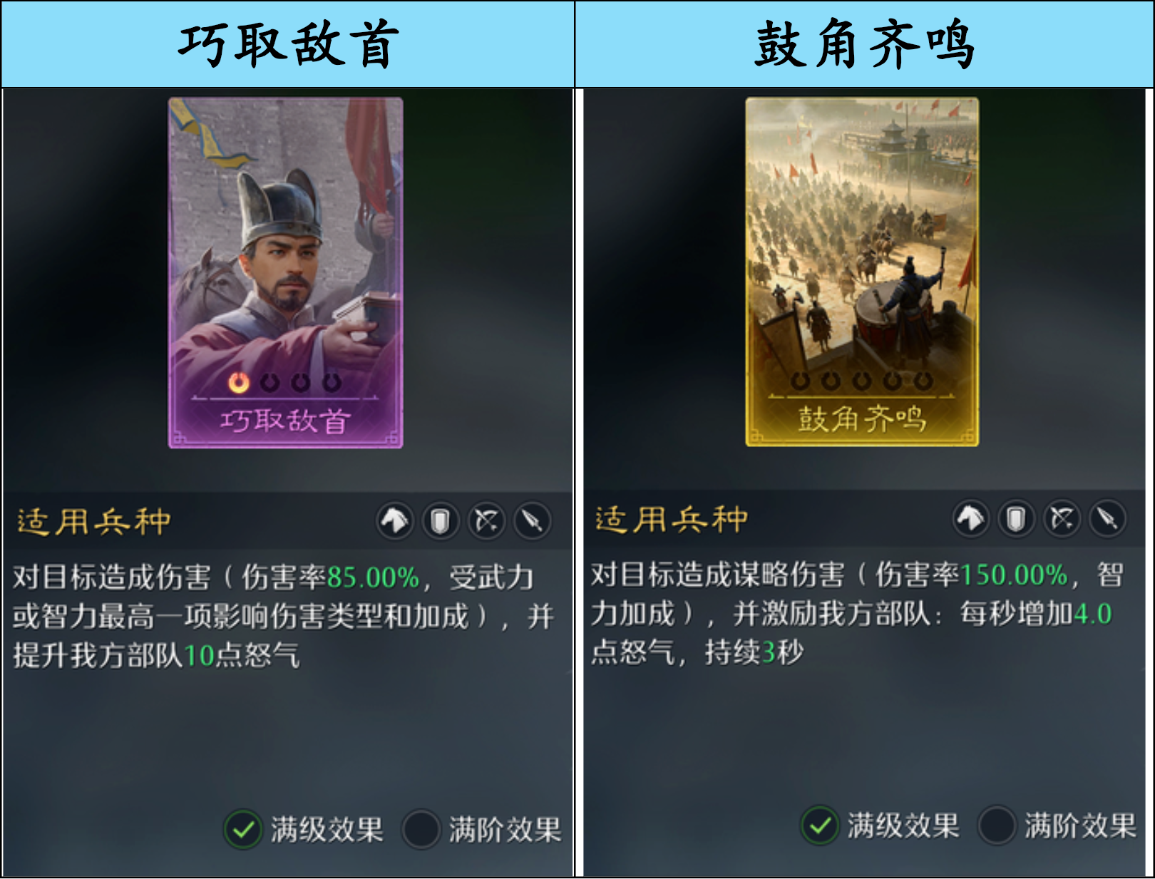 技能说明:这两个技能一般组合用来给突击队伍提供回复和增伤,是【诸葛驽军】或【全军突击】的替代。