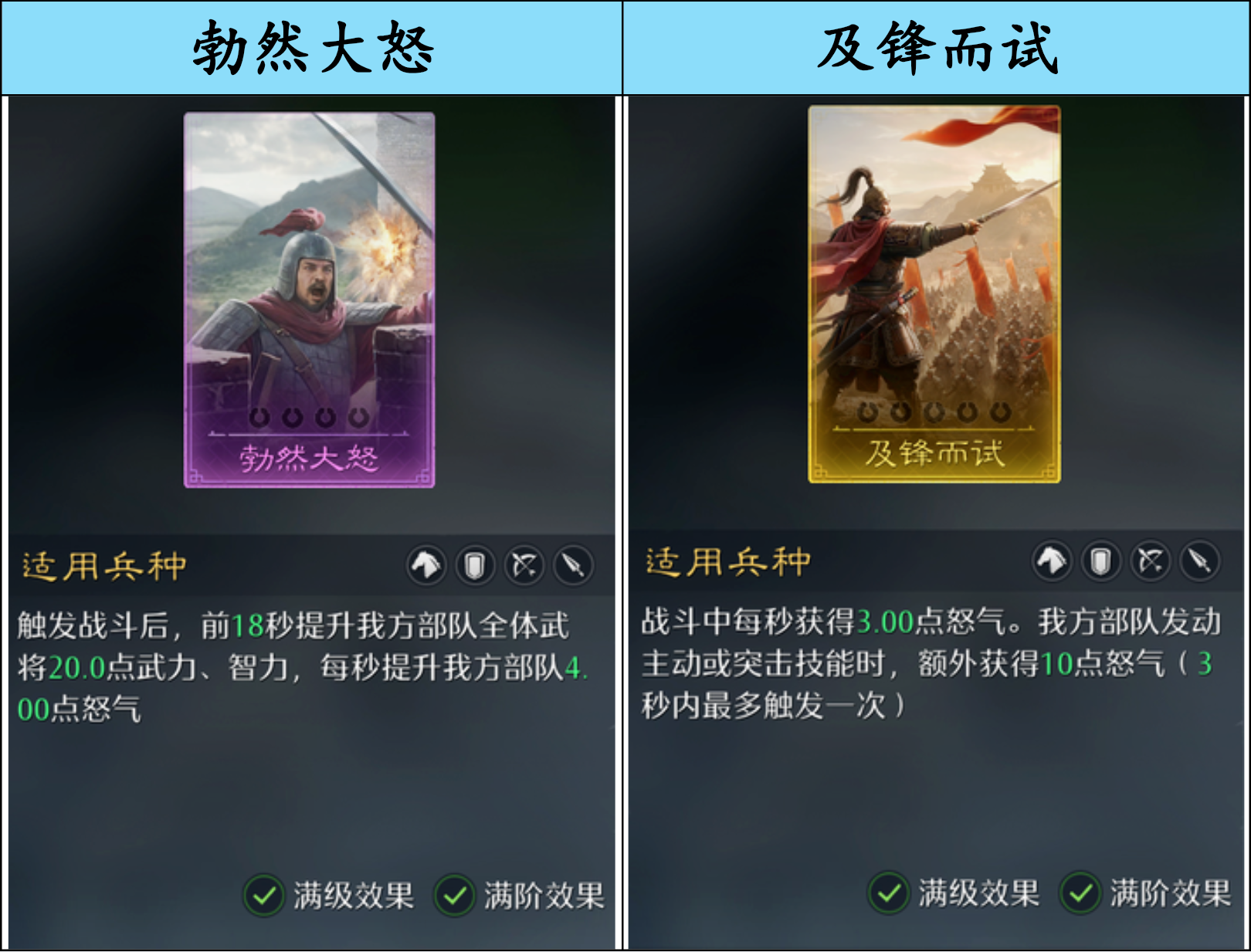 技能说明:【及锋而试】下位替代,实战中18秒的效果完全够打出主将技了,而且还有属性提升效果,平民玩家完全可以替代使用。
