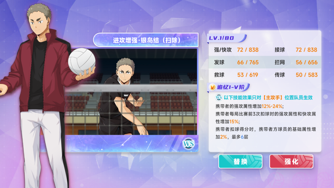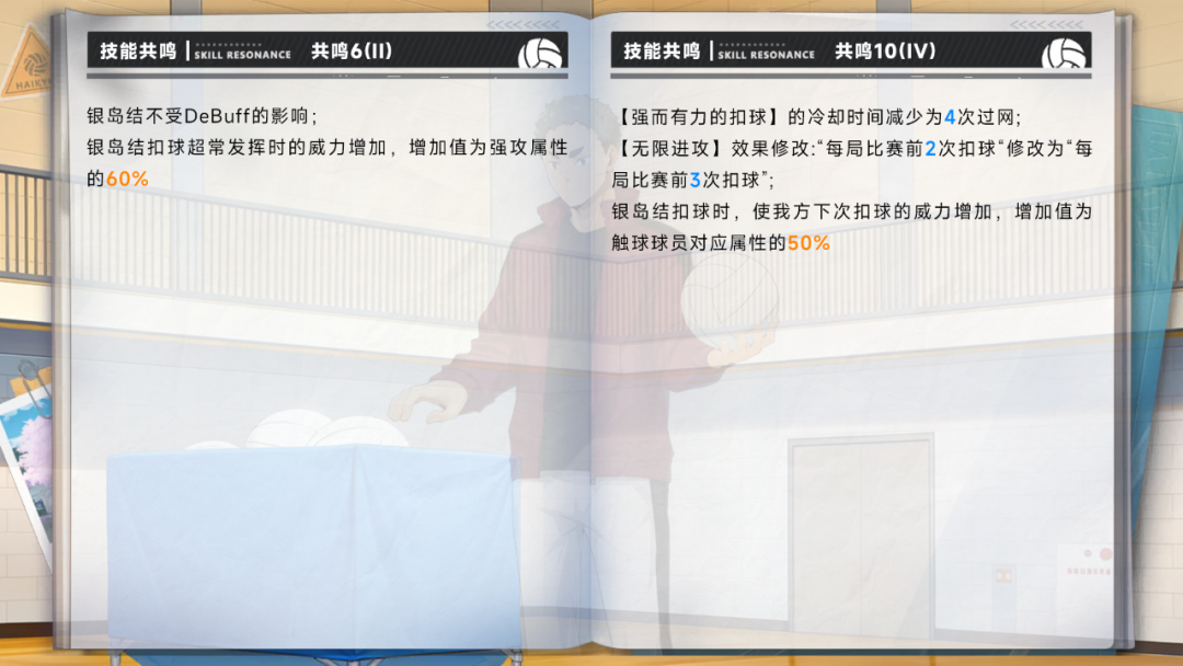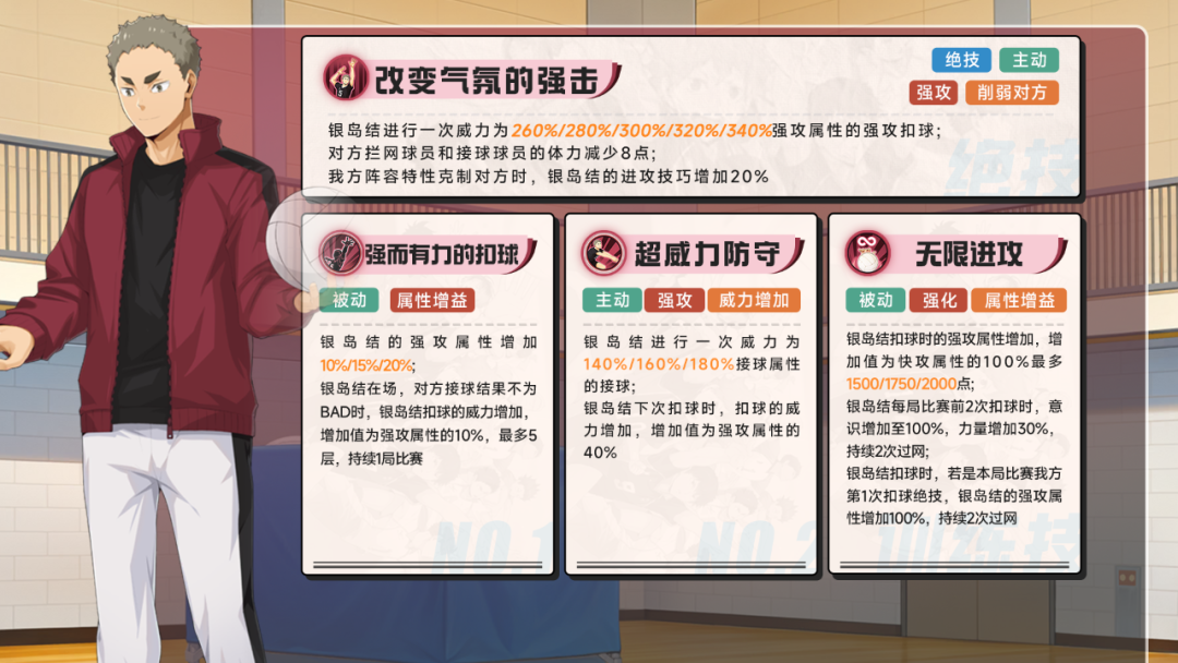 银岛结在场,对方接球结果不为BAD时,银岛结扣球的威力增加,增加值为强攻属性的10%,最多5层,持续1局比赛