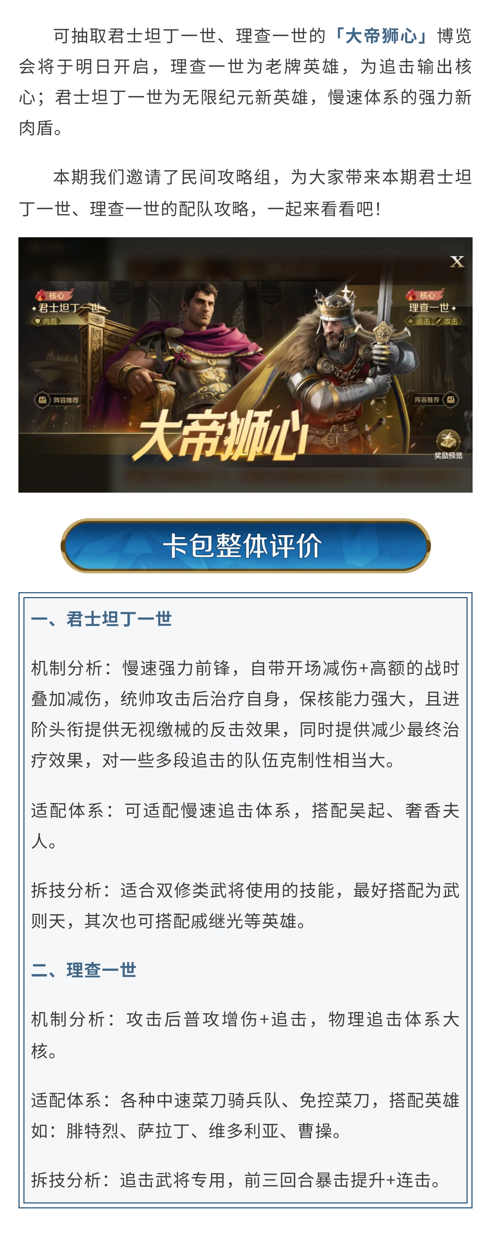 攻略分享丨「大帝狮心」博览会:君士坦丁一世、理查一世配队攻略